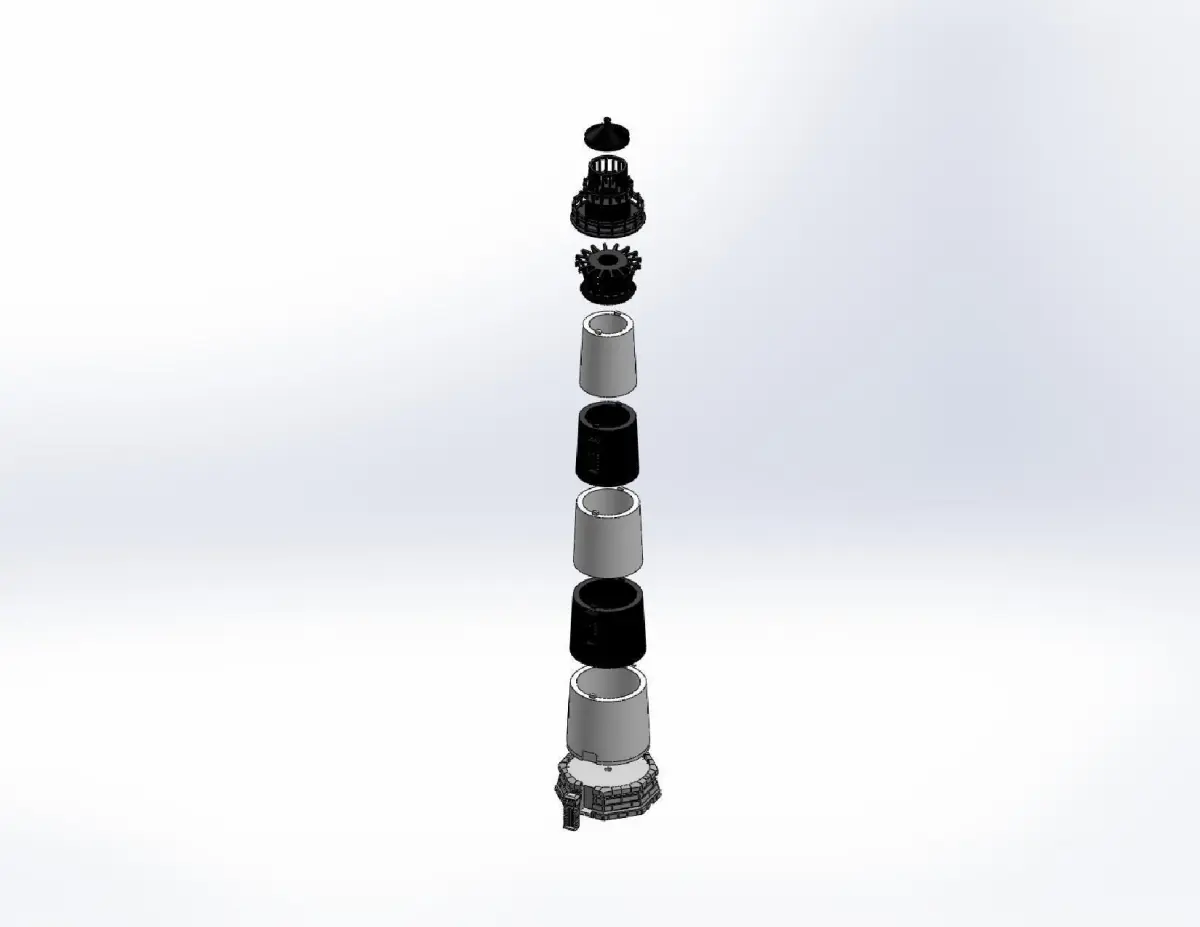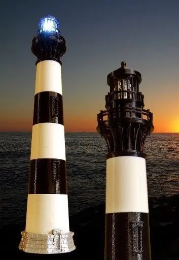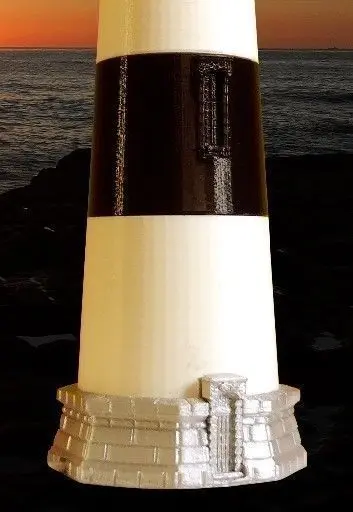 Notes: 1. 1/100 scale model of the lighthouse located south of Nags Head, NC. 2. This replica incorporates the full detail of the sentinel and stands at 19 inches with a 4.25 inch base. 3. Recommended Filament Color(s): Silver for the Base and Door; White for Cylinders A, C and E; Black for Cylinders B, D and all other components. 4. Recommended Print Settings: The Metal Ring, Gallery/Light Ring and the Top components should be printed at an extrusion speed of 20mm/s for the best detail. This translates into a Fine or Detailed setting if streaming. The streamed files follow this order: Base, Door, Cylinders A-E, Metal Ring, Gallery/Light Ring and Top. 5. Other Assembly Components: Two-inch candelabra socket, eight inch white cord set w/switch and LED candelabra bulb (see pics or [Assembly Instructions](http://www.outerbankslights.com/wp-content/uploads/2014/12/Bodie_Island_Lighthouse_Assembly.pdf)).