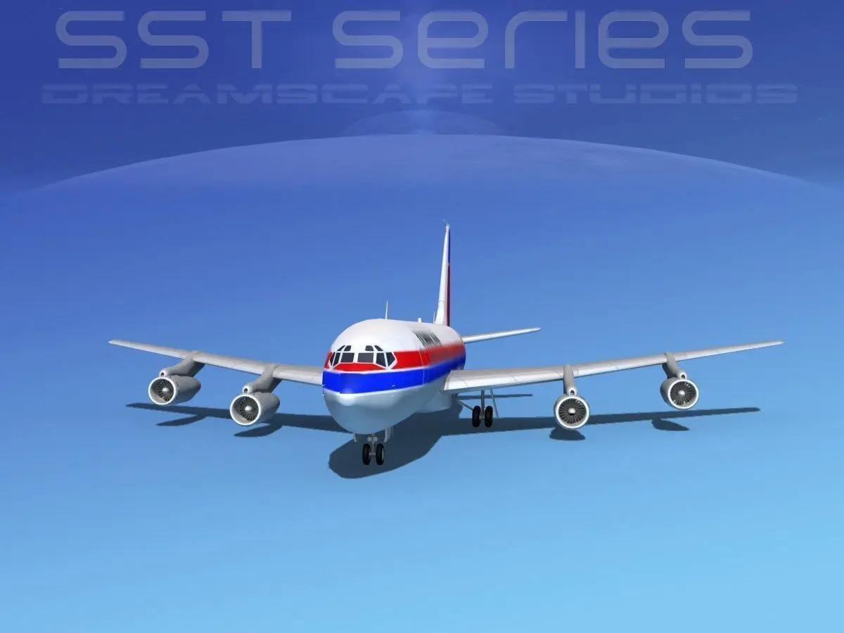This Boeing 707-320 is built near to scale within a few percent of actual general dimensions. This medium poly model includes smooth exterior with some detail and a realistic rendering appearance. It is built with single sheet textures with a 2000x 2000 resolution. It also has landing gear that can be “turned off or hidden” for inflight animation. This model doe not have the animateable control surfaces of our non-sst model. This is the first model Dreamscape has produced with both single sheet textures and a full complement of liveries giving the user a wide variety of models to choose from.