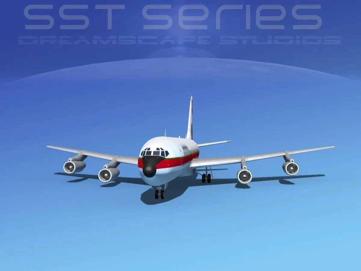 This Boeing 707-320 is built near to scale within a few percent of actual general dimensions. This medium poly model includes smooth exterior with some detail and a realistic rendering appearance. It is built with single sheet textures with a 2000x 2000 resolution. It also has landing gear that can be “turned off or hidden” for inflight animation. This model doe not have the animateable control surfaces of our non-sst model. This is the first model Dreamscape has produced with both single sheet textures and a full complement of liveries giving the user a wide variety of models to choose from.
