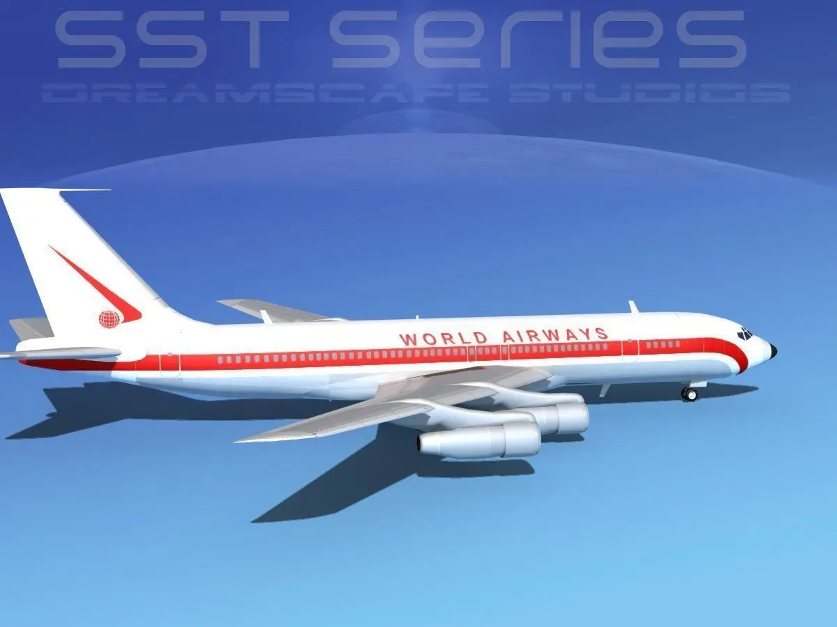 This Boeing 707-320 is built near to scale within a few percent of actual general dimensions. This medium poly model includes smooth exterior with some detail and a realistic rendering appearance. It is built with single sheet textures with a 2000x 2000 resolution. It also has landing gear that can be “turned off or hidden” for inflight animation. This model doe not have the animateable control surfaces of our non-sst model. This is the first model Dreamscape has produced with both single sheet textures and a full complement of liveries giving the user a wide variety of models to choose from.
