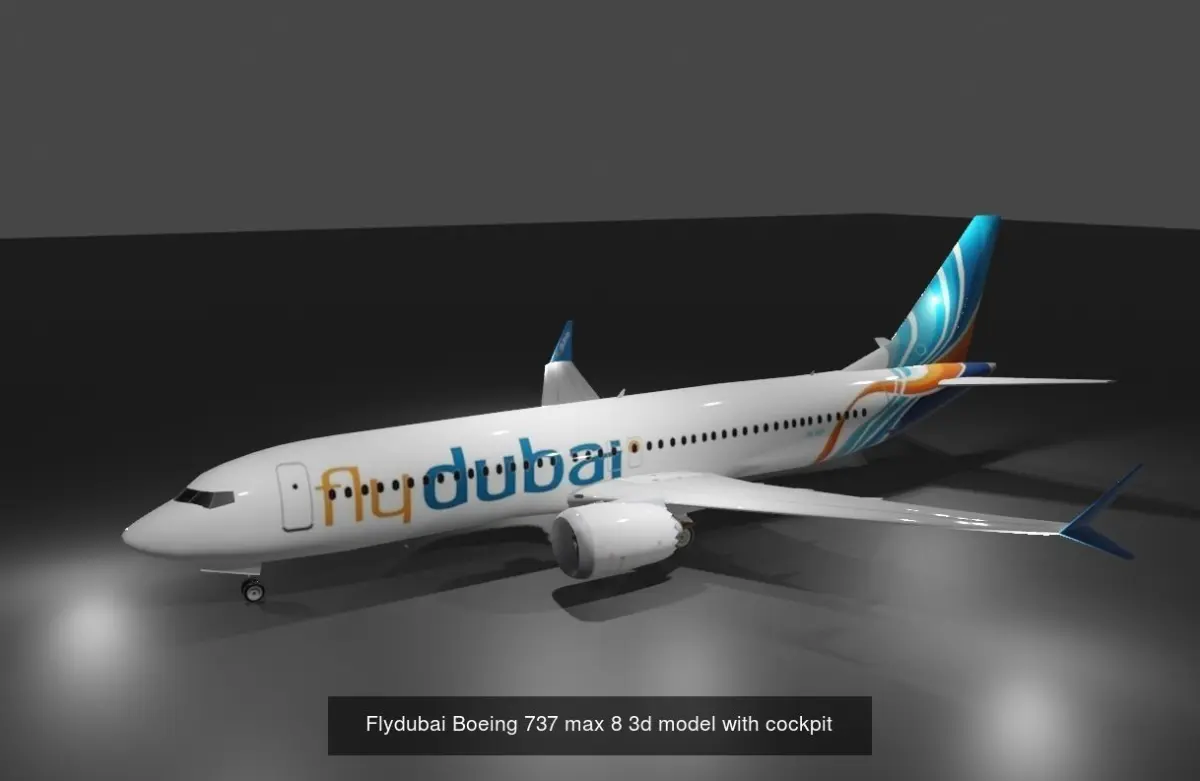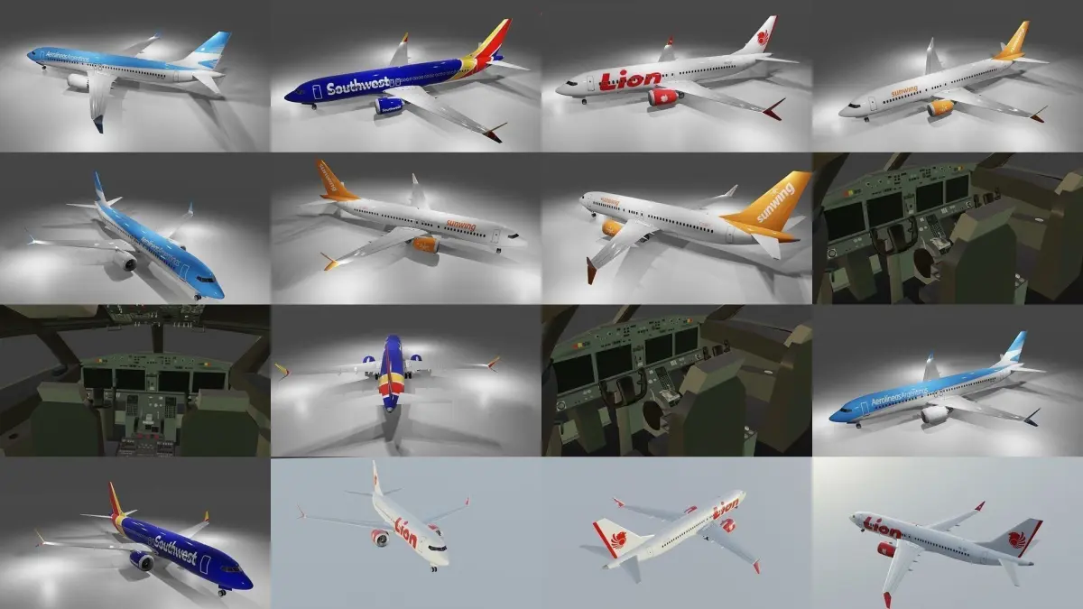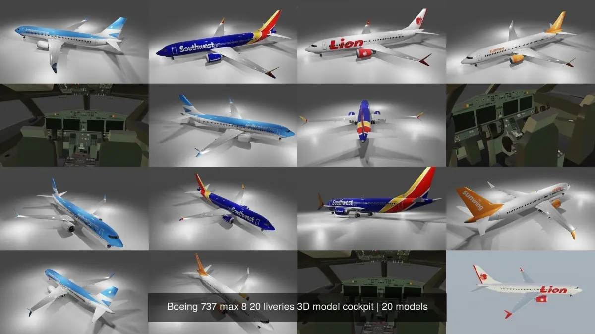 heres a 3d model of this aircraft in 21 liveries, it also includes a decently modelled low poly cockpitthe liveries are Sunwing,Lion Air,Southwest Airlines,Aerolineas Argentinas,China Eastern,LOT Polish Airlines,Flair airlines,Air India ExpressTurkish airlines,Smartwings,Iceland air,United airlines,Akasa air,Ethiopian airlines,Alaska Airlines,TUI Airlines,Ryanair,Vietjet