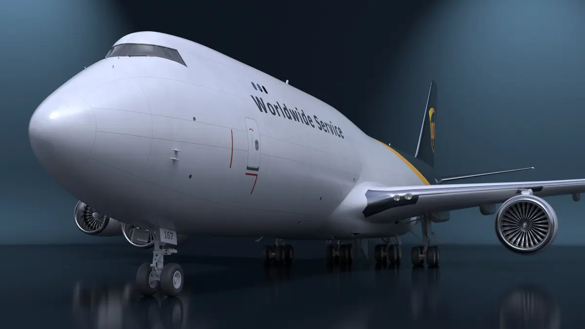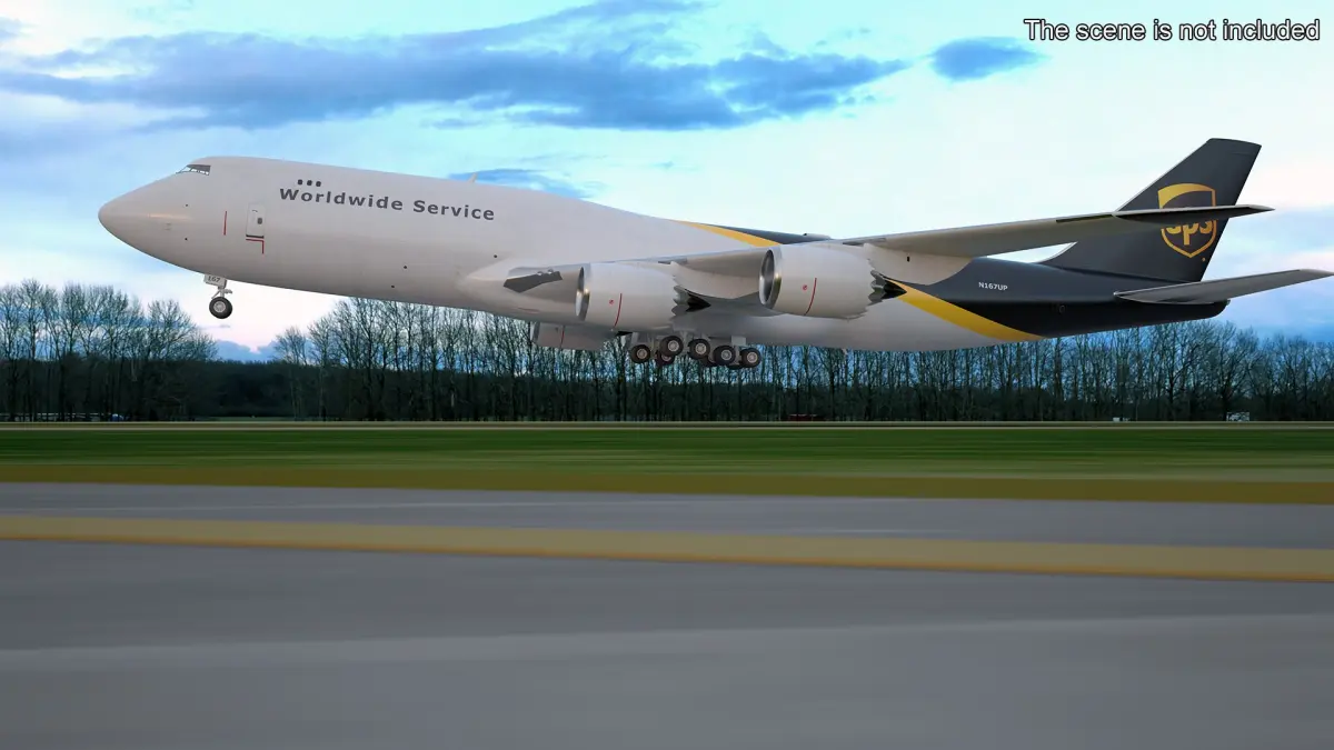 The model captures the distinctive design of the Boeing 747, including the humpback upper deck, detailed cargo doors, and realistic engine nacelles. It also includes accurately modeled landing gear and control surfaces. The UPS branding is meticulously recreated, making this model ideal for aviation logistics and transport simulations with high visual fidelity.