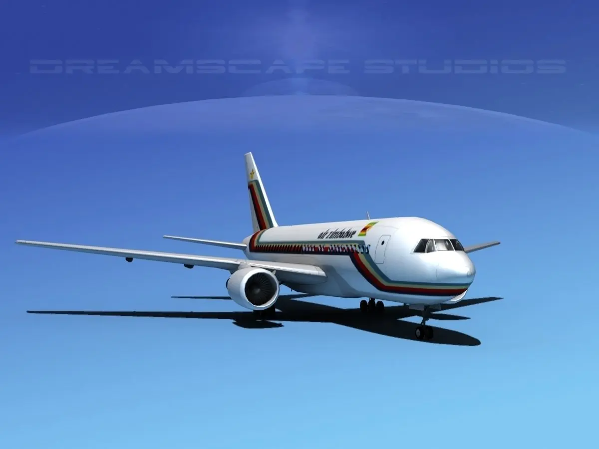 Boeing 767-200ER Air Zimbabwe This model is originally built in 3DStudioMax 13 and rendered in standard scanline. It is built very near to scale, within 3% of actual general dimensions. It includes animateable control surfaces and retractable or hidden landing gear and animateable turbines. The model is built to be used in in-flight animations and video or simulation. It can also be used to populate an airport scene. This model is presented in 63 different airline paint schemes and textures. It is also available in 8 different formats.