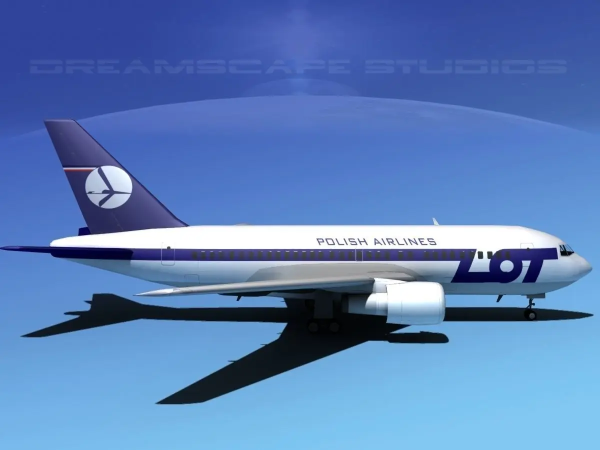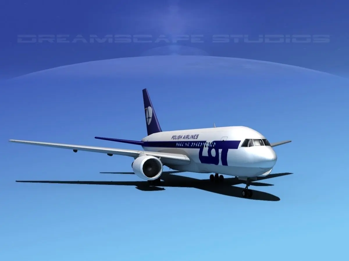 Boeing 767-200ER Polish LOT This model is originally built in 3DStudioMax 13 and rendered in standard scanline. It is built very near to scale, within 3% of actual general dimensions. It includes animateable control surfaces and retractable or hidden landing gear and animateable turbines. The model is built to be used in in-flight animations and video or simulation. It can also be used to populate an airport scene.This model is presented in 63 different airline paint schemes and textures. It is also available in 8 different formats.