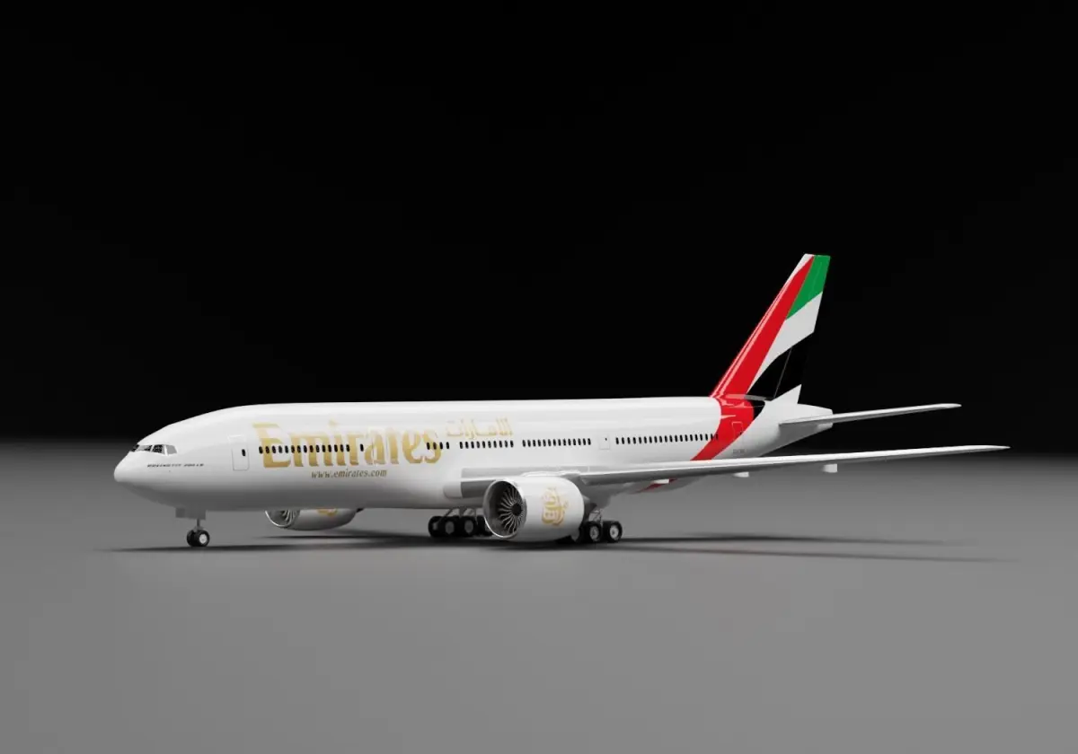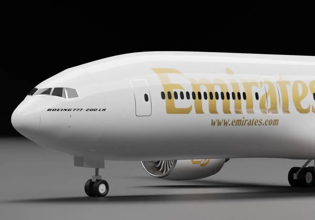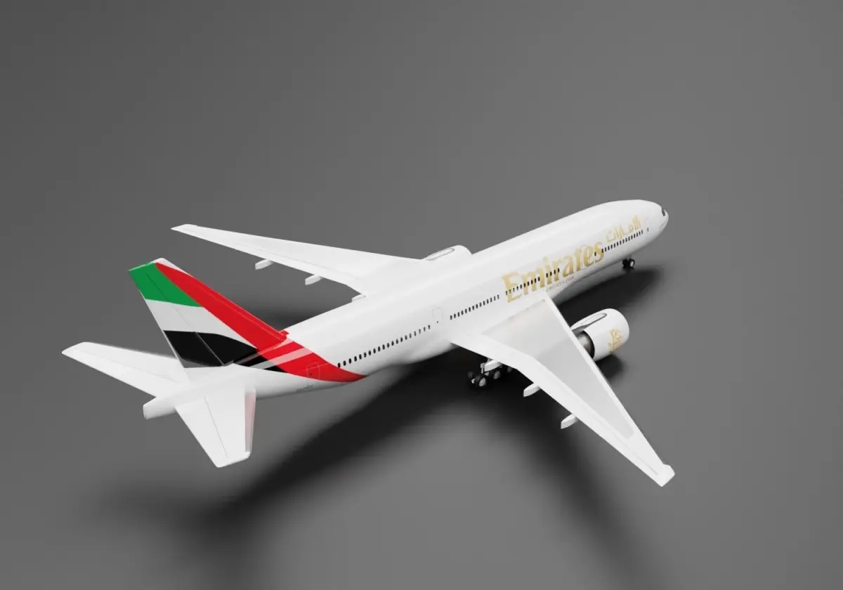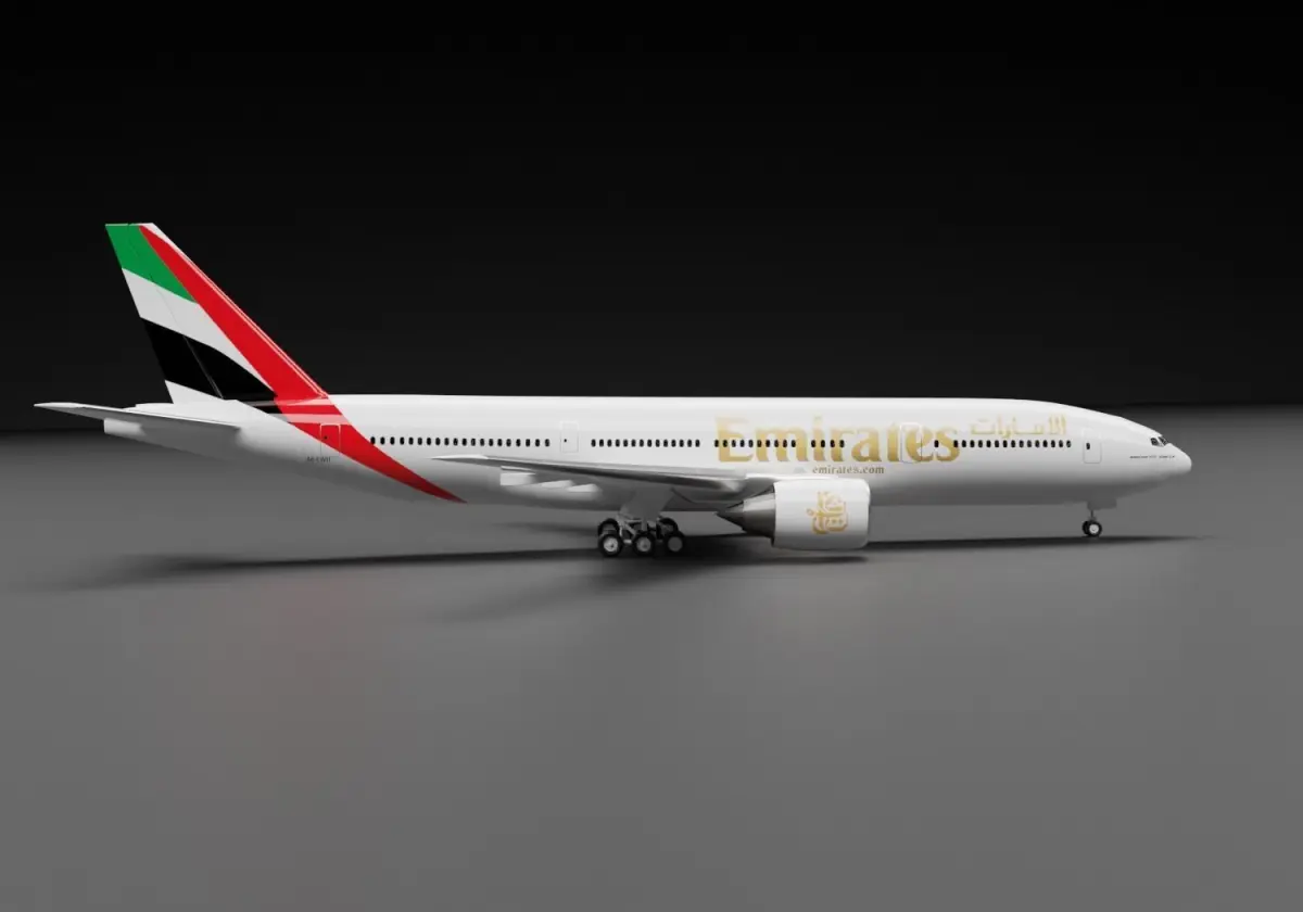 This is a 3d model of a Boeing 777-200 with an Emirates livery