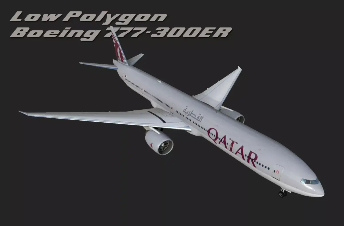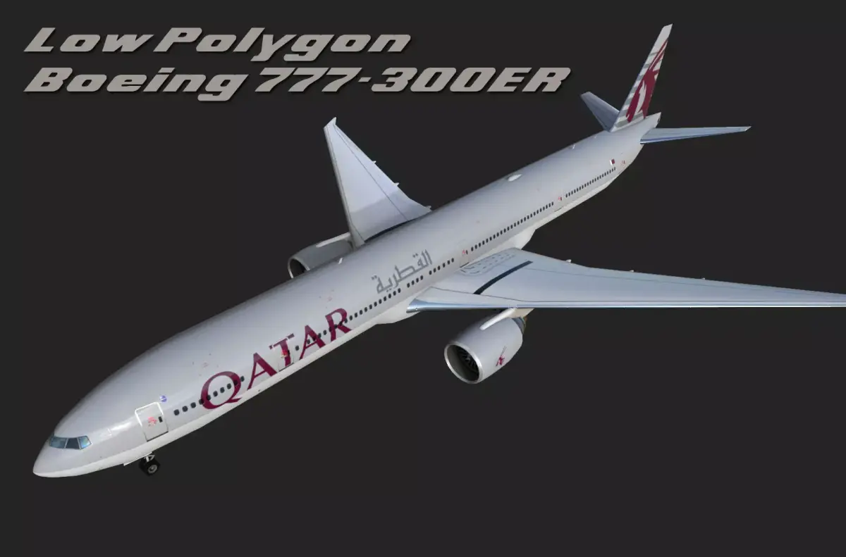 This is a low polygon version of the -300 version of the aircraft. Highly optimized, includes Qatar Airways PBR textures. All the textures are 4096 x 4096 pixels. (Includes Composite, Albedo, Roughness, Metallic, AO, Height and Normal textures). Most UV maps are unwrapped without overlapping, very few with overlap.