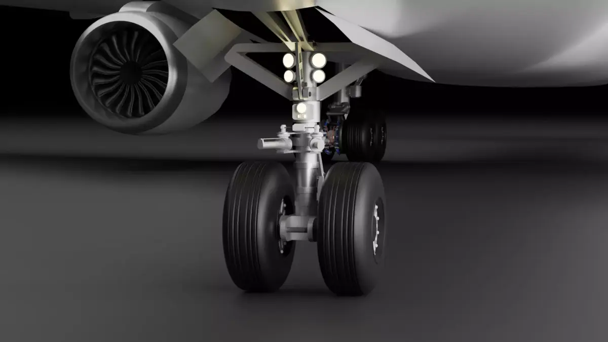 Modeled exterior includes: fuselage, engines, wings, landing gear, cockpit windows, and detailed tail section