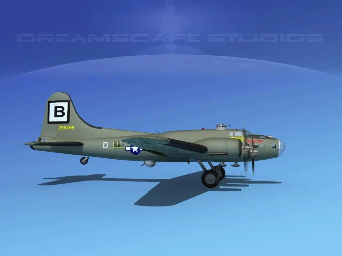 B-17 is built very near to scale and is fully textured. It has animateable flaps, ailerons, landing gear, landing gear doors, elevators, rudder, bomb bay doors and turret guns. Propellers are animated. HP version has a fairly detailed cockpit, radio room, bomb bay, navigator station and waist gunners station. It also has bombs. Both model versions have detailed landing gear. HP version also has detailed engines. Models are available in many formats.