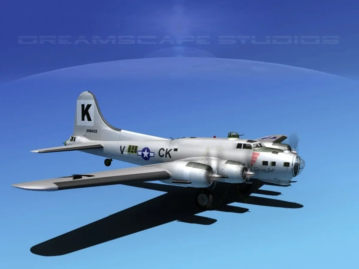 B-17 is built very near to scale and is fully textured. It has animateable flaps, ailerons, landing gear, landing gear doors, elevators, rudder, bomb bay doors and turret guns. Propellers are animated. HP version has a fairly detailed cockpit, radio room, bomb bay, navigator station and waist gunners station. It also has bombs. Both model versions have detailed landing gear. HP version also has detailed engines. Models are available in many formats.