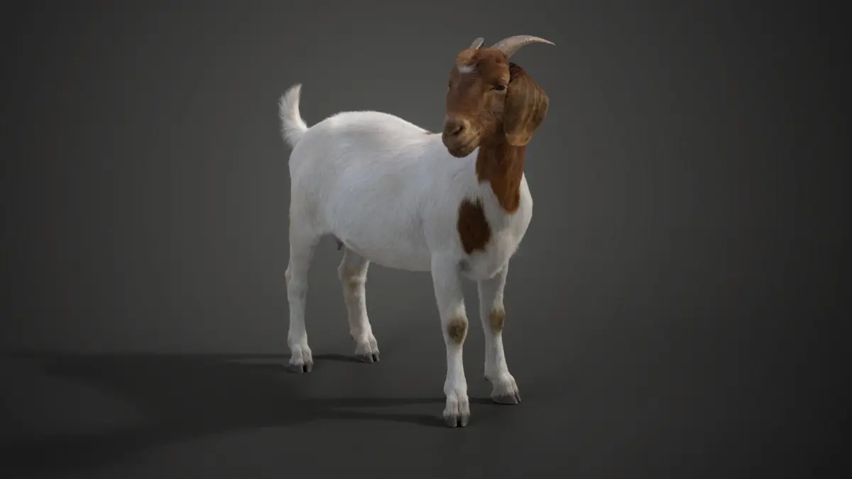 This is a high-quality boer goat with multiple 4K UDIM maps, fur, rigging, and animation. It has very detailed muscle structures and a realistic oral cavity, and is made with Blender and Cycles renderer at real-world scale. The skin maps and hair maps are made separately for some realism.