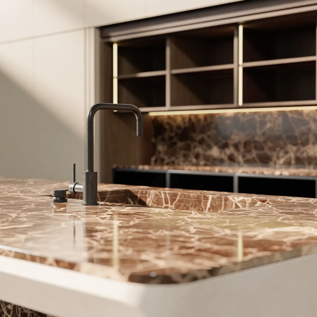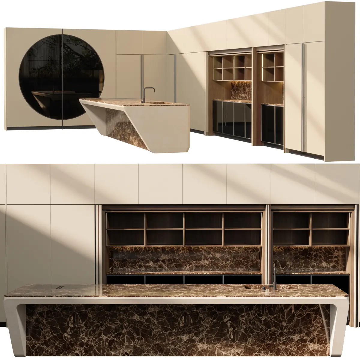 A luxurious and modern kitchen environment inspired by the iconic Boffi Cove design. This high-fidelity model was created in Blender, with all materials and textures carefully crafted in Substance 3D Painter. Rendered in V-Ray for photorealistic quality.