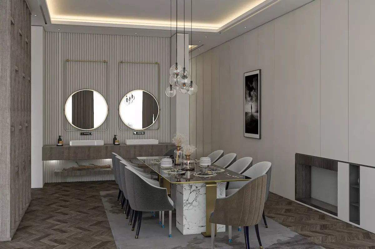 This is dining room design what you can ajdust and use for your required design. I created this with 3ds max 2022 and all the rendering settings are included. adjust your size and render. Branding you will have to and make it more beasutiful.