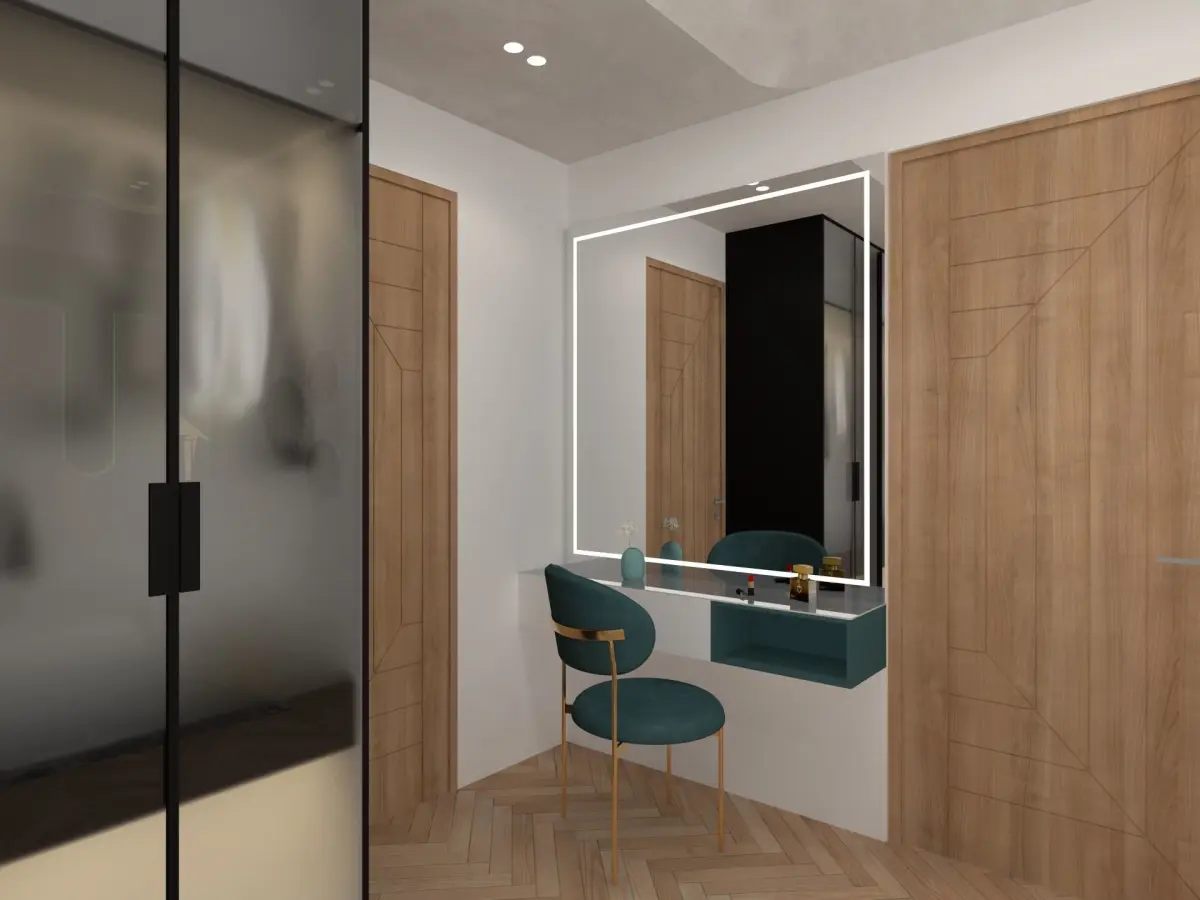 In model:King-size upholstered bedSide tablesBoho wall artFloor lamp & wall lampWardrobe with clothsFluted wall panel