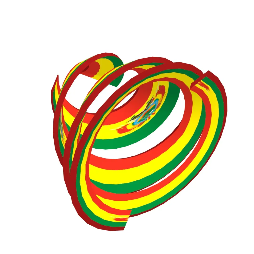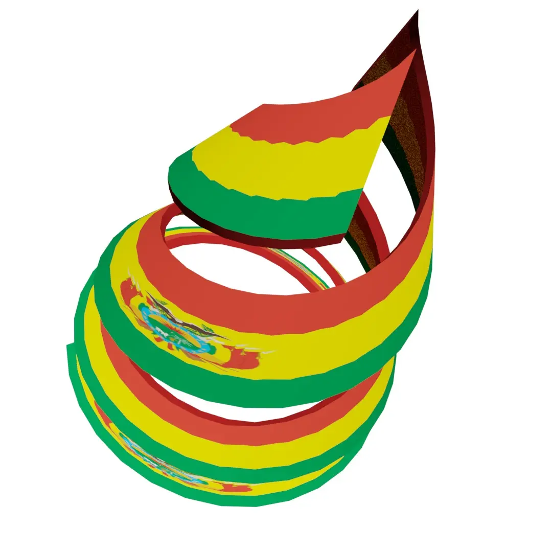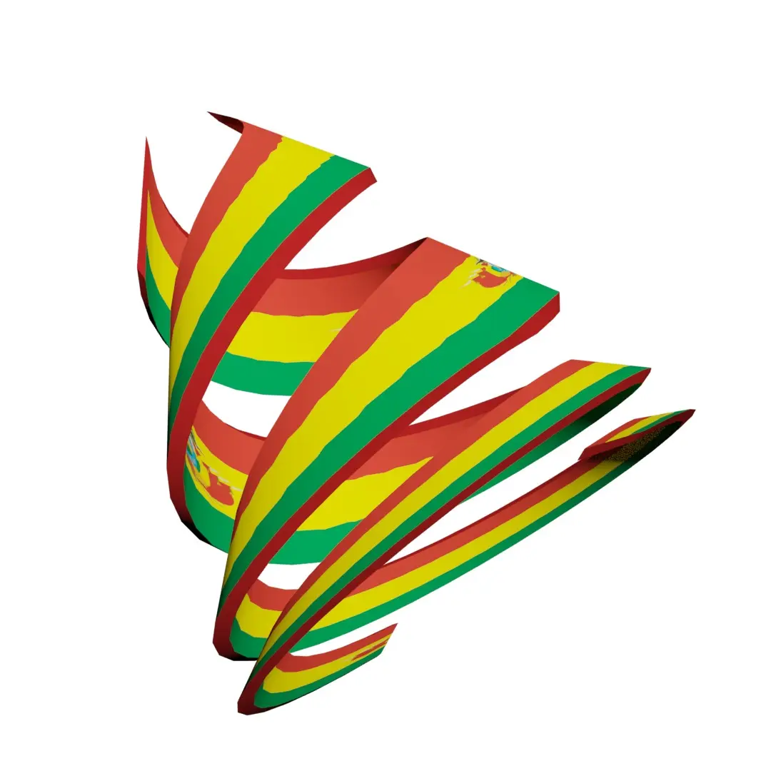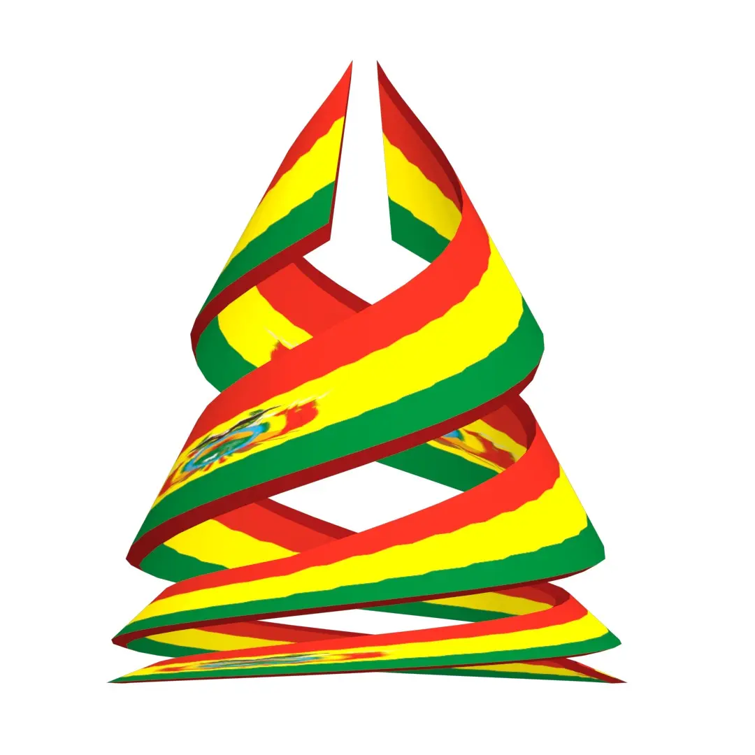 A 3D Double Helical Structure of Bolivian flag. The national flag of Bolivia is a tricolor rectangle, with the colors red, yellow and green, in a ratio of 1:1:1, the red on the superior part occupying a third of the flag’s width, yellow in the middle band using the same width, and green in the inferior part. Bolivia is a landlocked country located in central South America. It is a country with the largest geographic extension of Amazonian plains and lowlands, mountains and Chaco with a tropical climate, valleys with a warm climate, as well as being part of the Andes of South America
