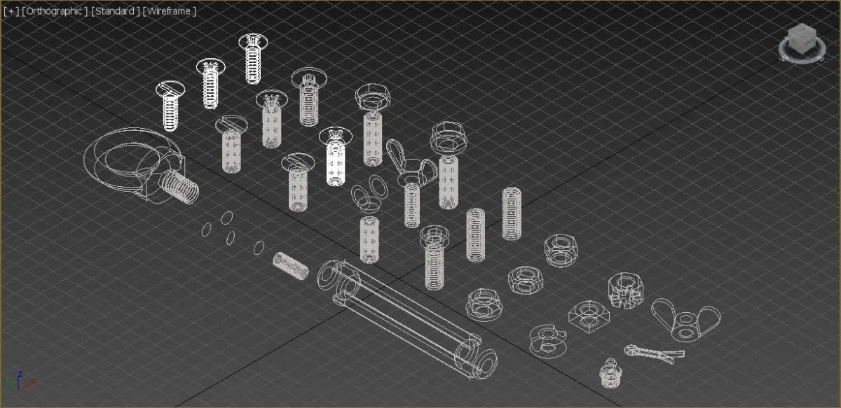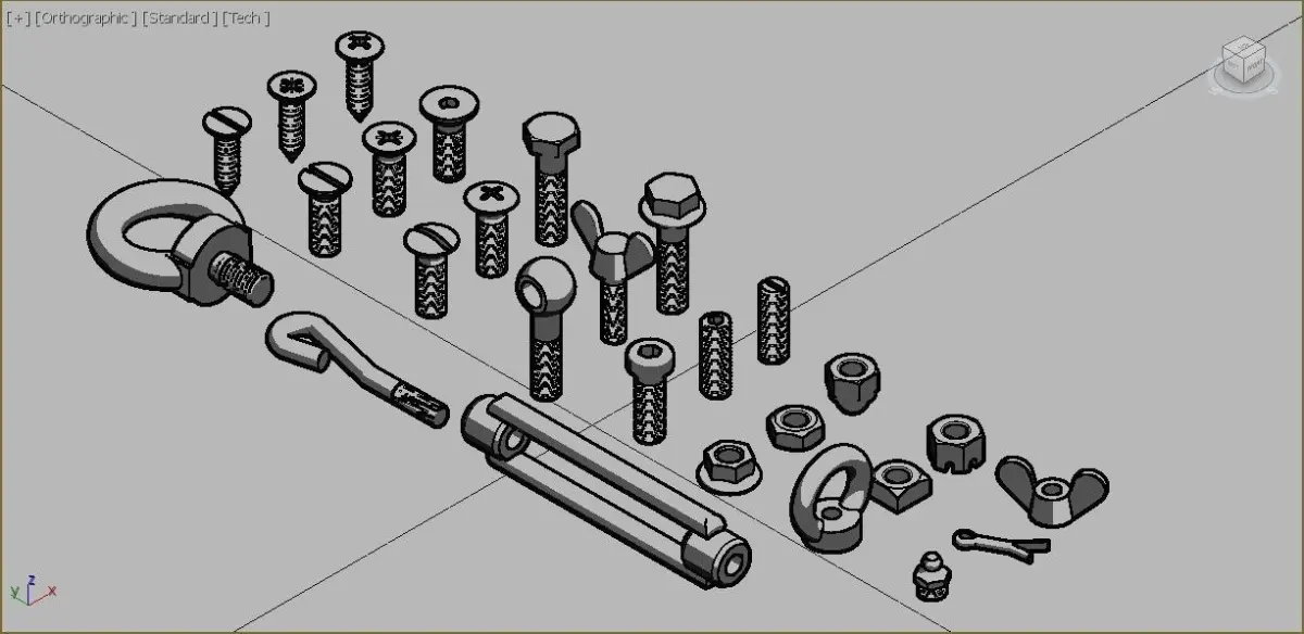 Bolts And Nuts Pack For Realistic Detailed 3D Threaded Models. Rendered with 3dsMAX for Vray. All bolts real 3D threaded. Hex head bolts, hex nuts, allen bolts, flat head screws, slotted head screws, External hex head bolts, eye bolts, set screws, sheet metal screws, wood screws, machine screws.