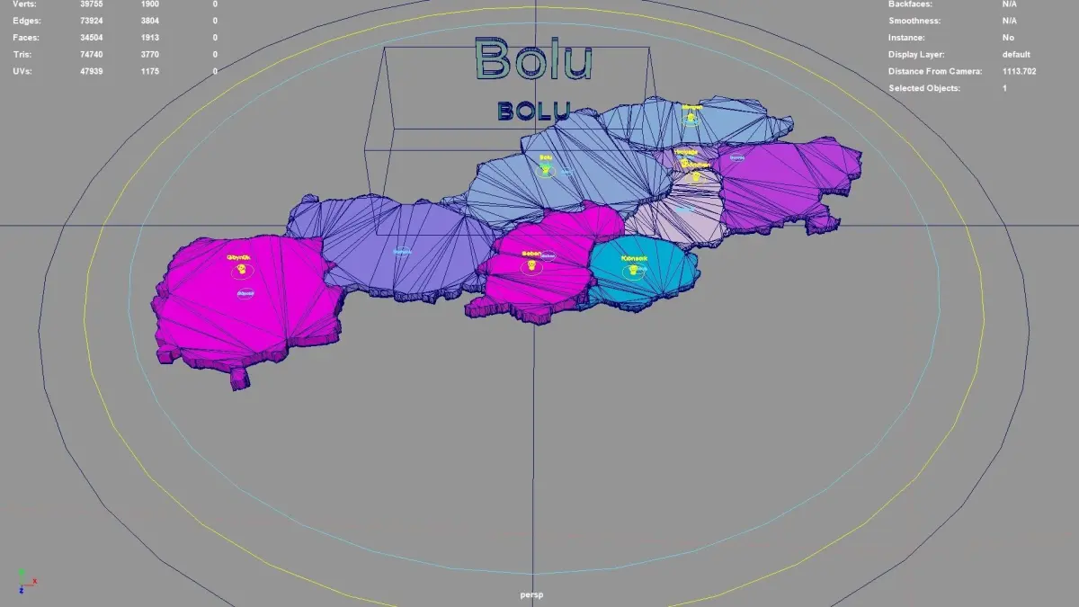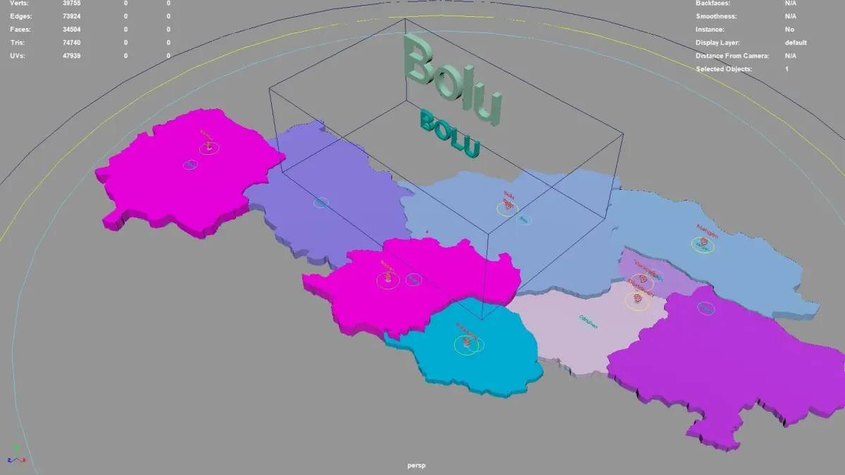 Bolu regions : The model is divided according to the administrative region of Bolu. Each region is clearly separated so you can easily isolate it or change the colors. Names are also editable and separate.