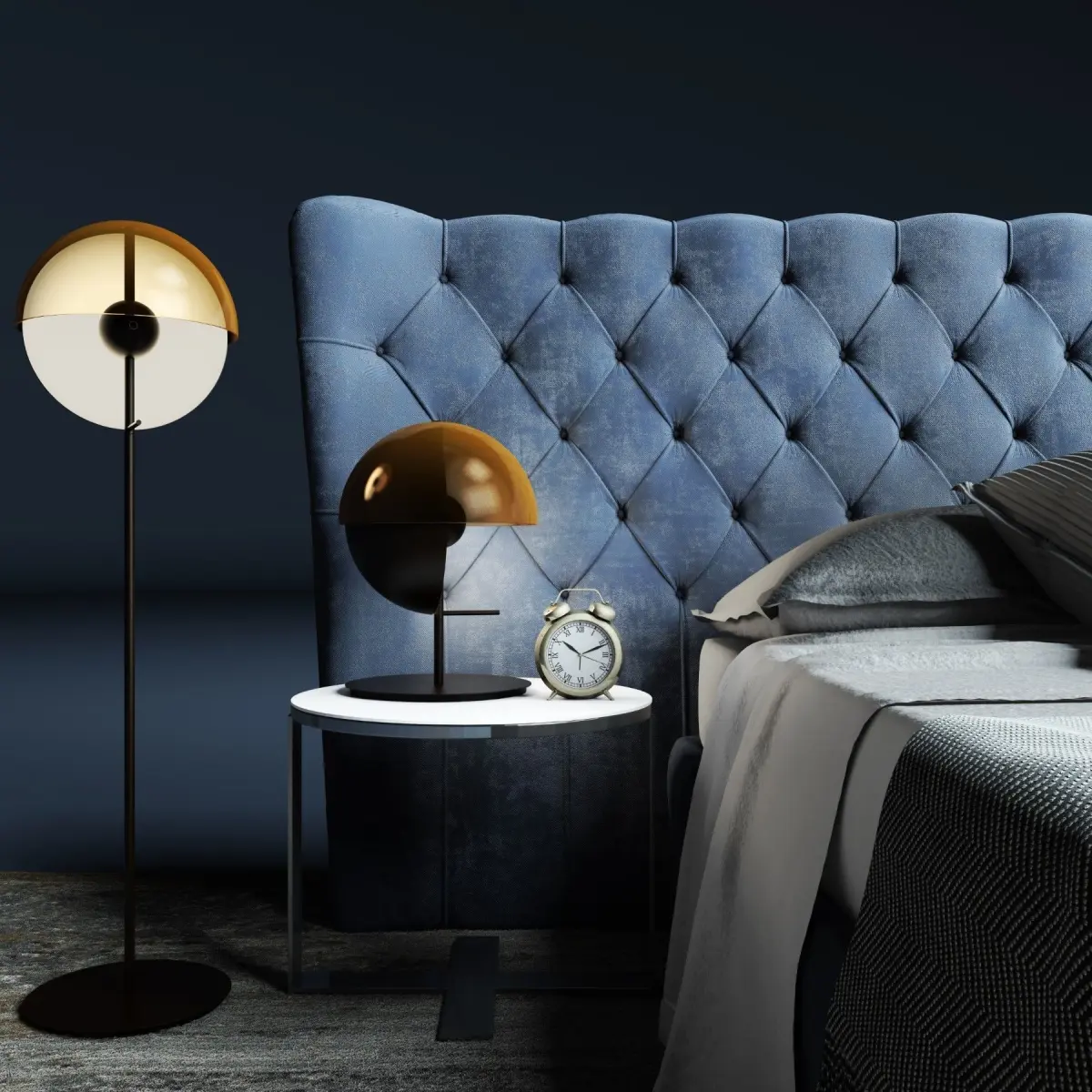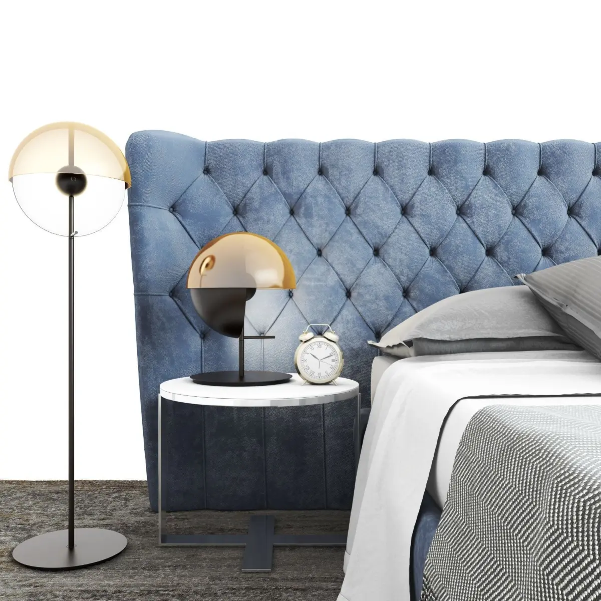 1, Selene extra large Bed 2, Eileen low table 3, Marset Theia table lamp 4, Marset Theia floor lamp , Puff 6, Alarm, books, accessories