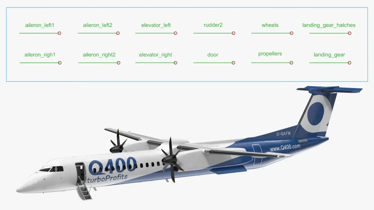 Bombardier Q400 NextGen 3d model is ready to be animated. You can easily position it the way you need or animate it the way your project requires using helpers in 3D Studio Max.