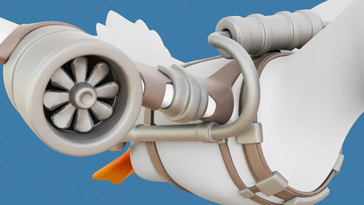 Bombardini Guzini is a stylized 3D model of a combat duck equipped with jet engines on its wings. The design is original, with a cartoon style perfect for games, animations, or creative projects. Created within the context of Italian Brainrot, he is the leader of the Guzini: absurd creatures ready for action and humor into any fantasy world.