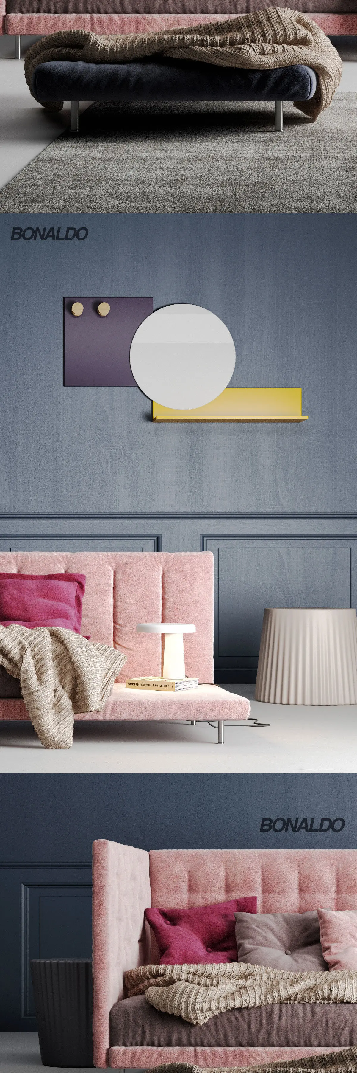 Model includes Bonaldo Alvar bed, Muffin and Piers pieces. Several materials and colors are included. Scene contains Hair & Fur modifier for microfibers.