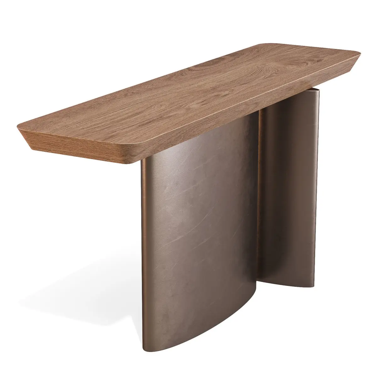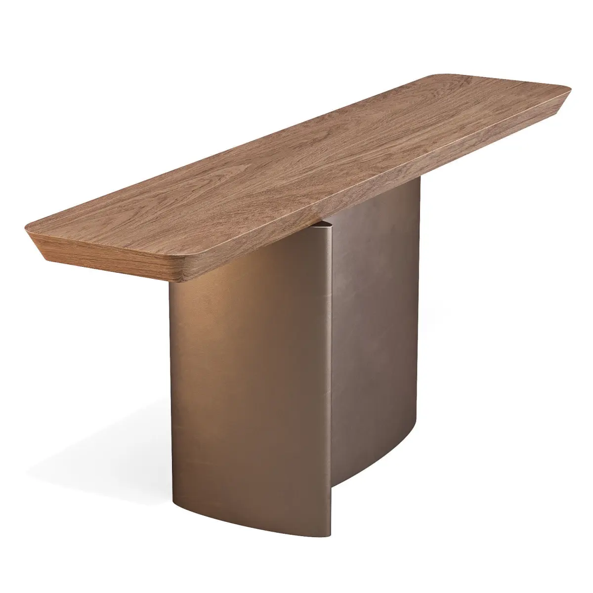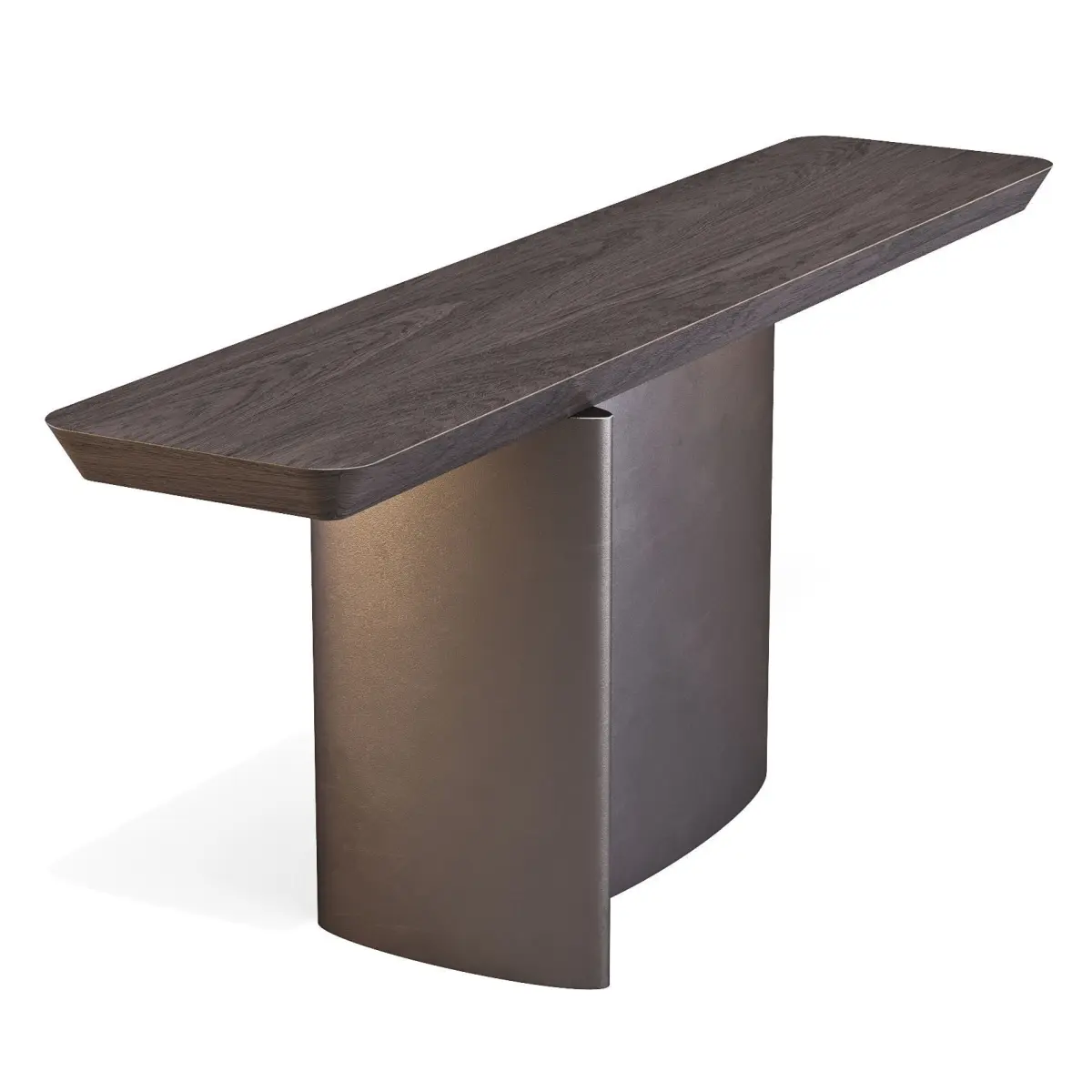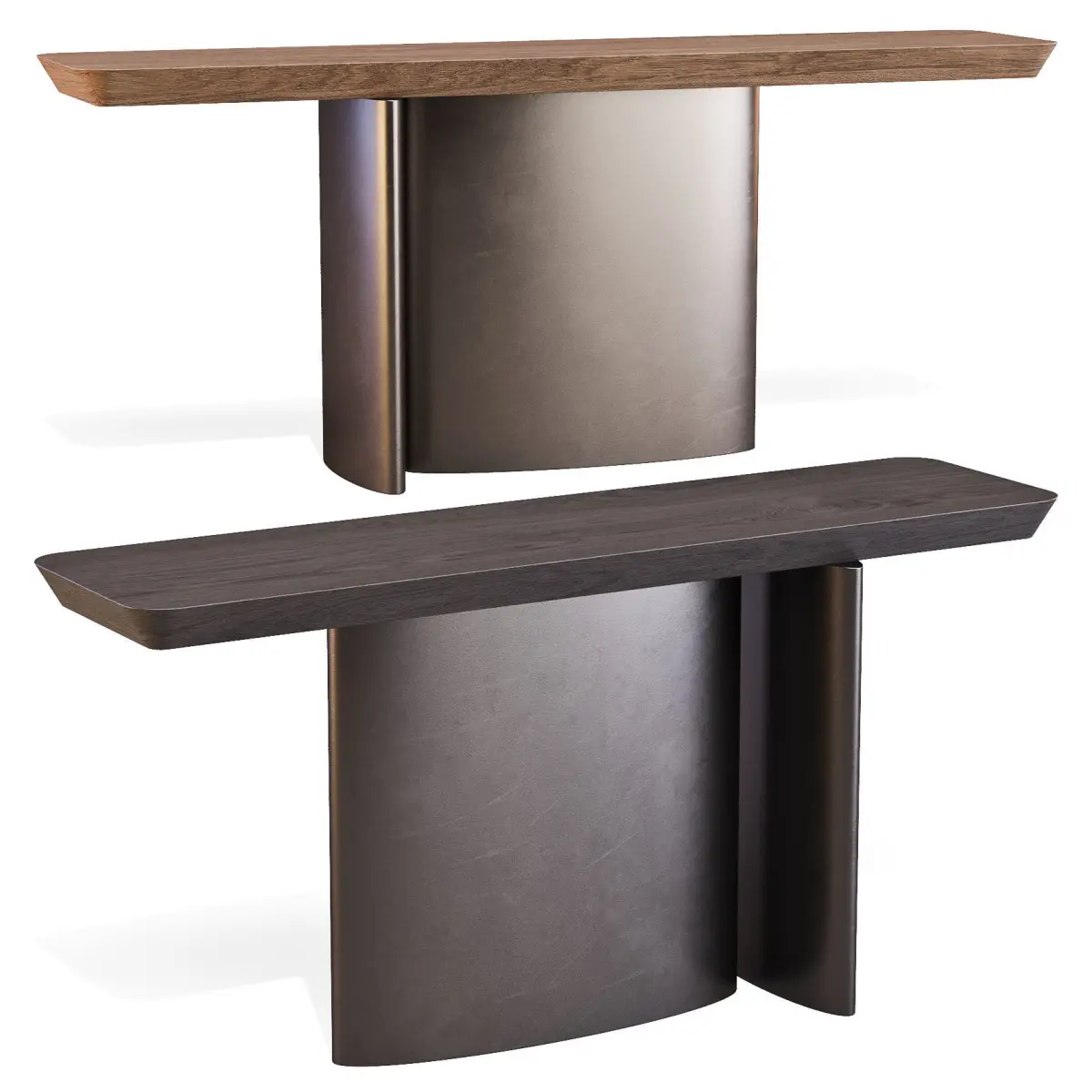 - The One Console presents an unexpected, unique and in some ways imperfect piece of architecture that recalls the Dolmens of prehistoric times, which were created by stacking irregular stones in a way that was apparently random and precarious. It is as if the elements that make up the console were not intended to be together, but had instead shifted unexpectedly away from their original position, thereby giving life to a contemporary and recognizable accessory with a striking top and unusual bases. A barely visible opening between the curved modules that form the base allows an interplay of light that illuminates the different profiles of the console’s supporting columns. The legs are very close toeach other, so much so that from different perspectives the distance is imperceptible; this generates visual instability and a surprising dynamic effect. At the same time, the interplay between the legs gives direction to the console, and therefore to the space in which it is placed. These unusual features give the product a personal richness, making it unique and particularly unexpected.