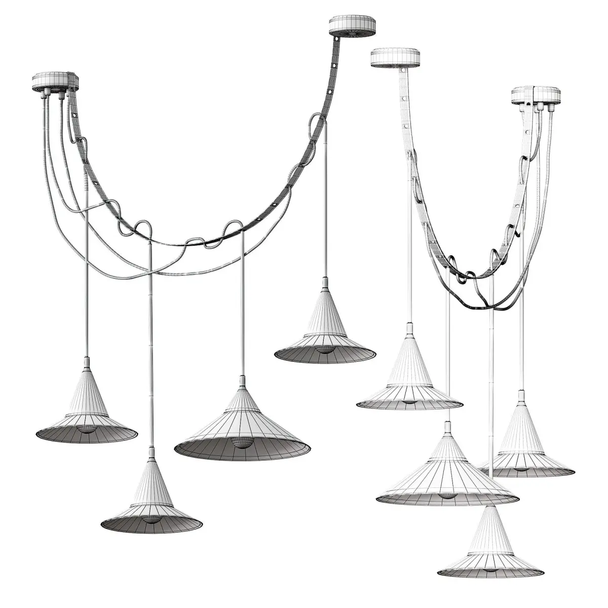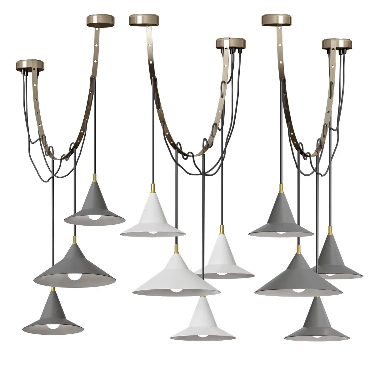 The San pendant lamp draws inspiration from the East: its shape pays homage to the typical headdresses worn in Asian countries, and the name comes from a Chinese word with a double meaning as it means an umbrella (sǎn) and at the same time is a suffix used as affectionate or honorary title between people of all ages and social status (dignity).Lampshades in brushed soft-touch painted metal are available in gray or white. The ceiling riser and curved support, through which the electrical cable runs and which can be used to adjust the height of the lamps, are made of matt pearl beige painted metal. The pendant is available with 3 or 4 shades.