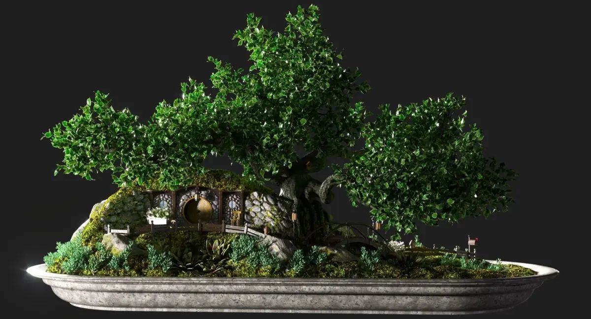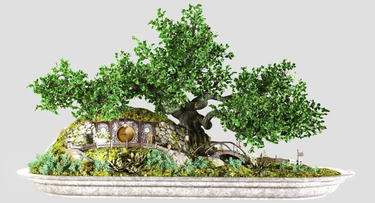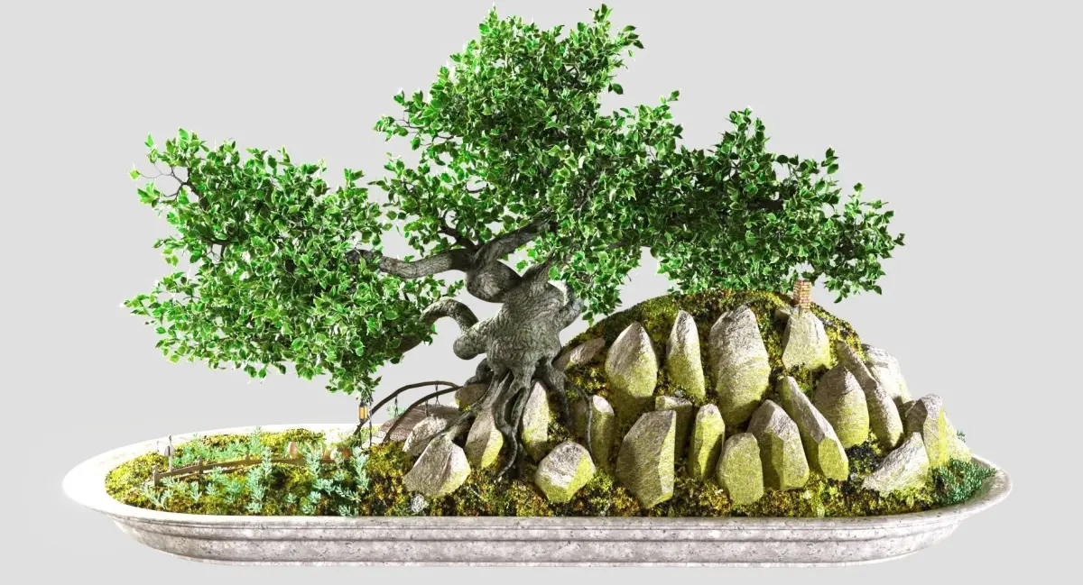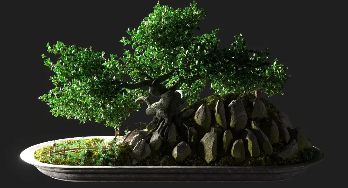 in the scene objects are combined into two objects, a tree with the material Multi/Sub-object and a vase with scenery with the material Multi/Sub-object