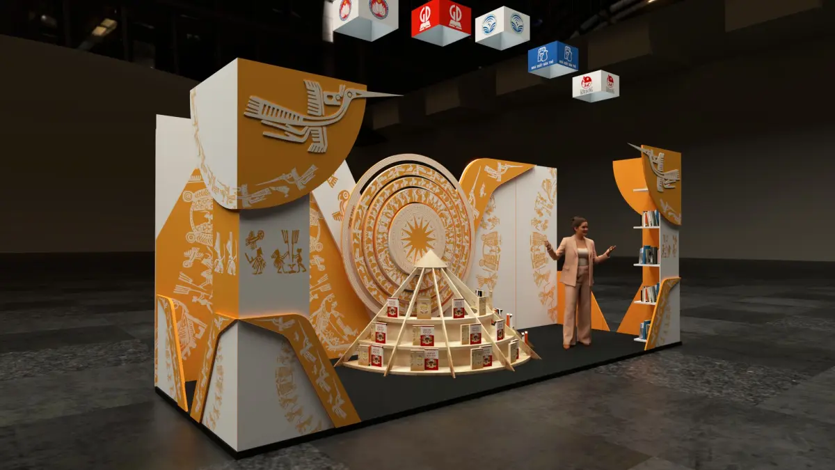 book stall frankfurt, gian hàng sách, quầy bán sách, trống đồng đông sơn, màu trắng vàng, gian hàng sách văn hóa, book exhibition stand, chim lạc, sketchup,obj,fbx,
