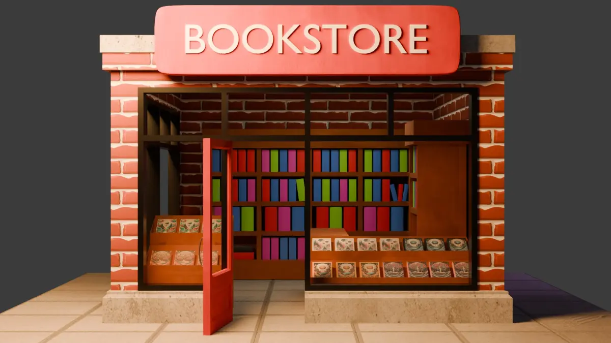 - Shelves: The store is lined with shelves filled with books in varying colors, sizes, and arrangements. This detail adds depth and realism, making it ideal for both exterior and interior shots of the store.