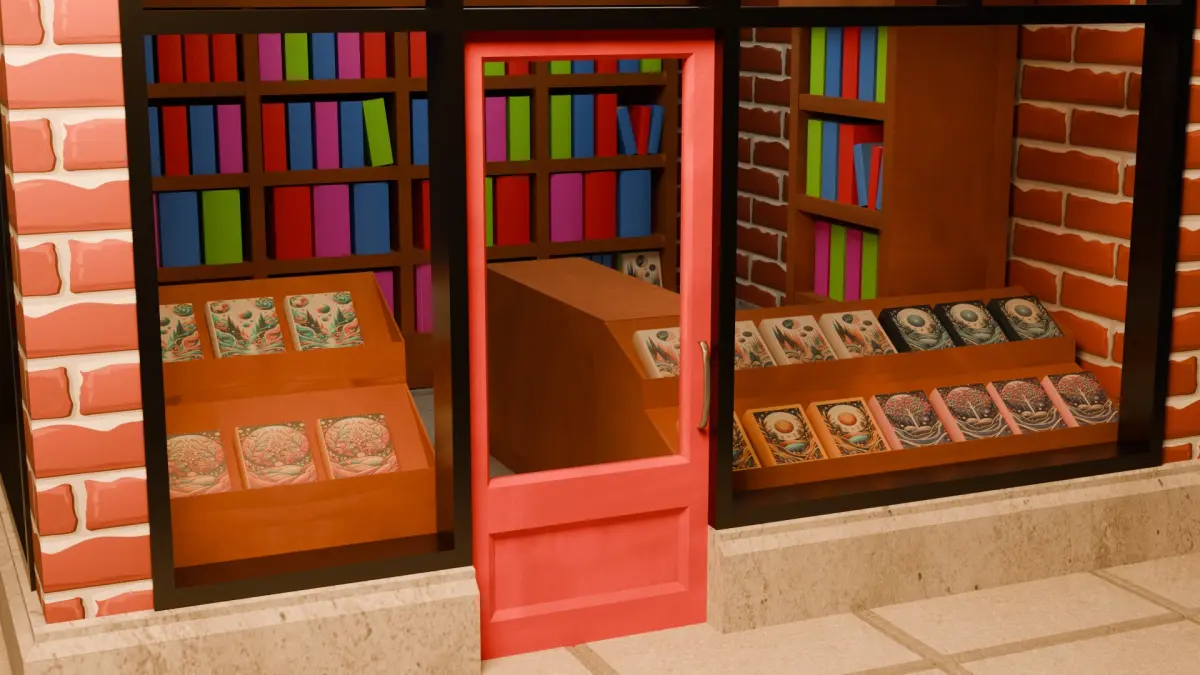 - Showcases: Two showcasing displays are positioned at the main entrance, filled with books that can capture the attention of passersby. The detailed textures and layouts of the book covers make these displays pop with realism.