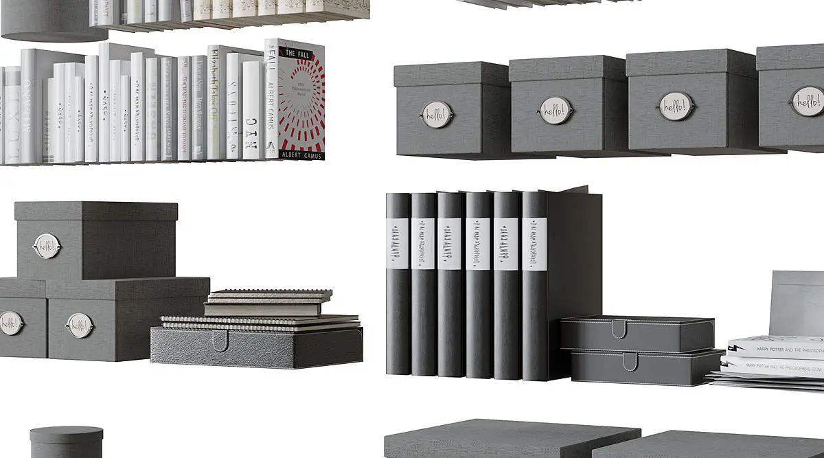 A set of books and decor on the shelves.