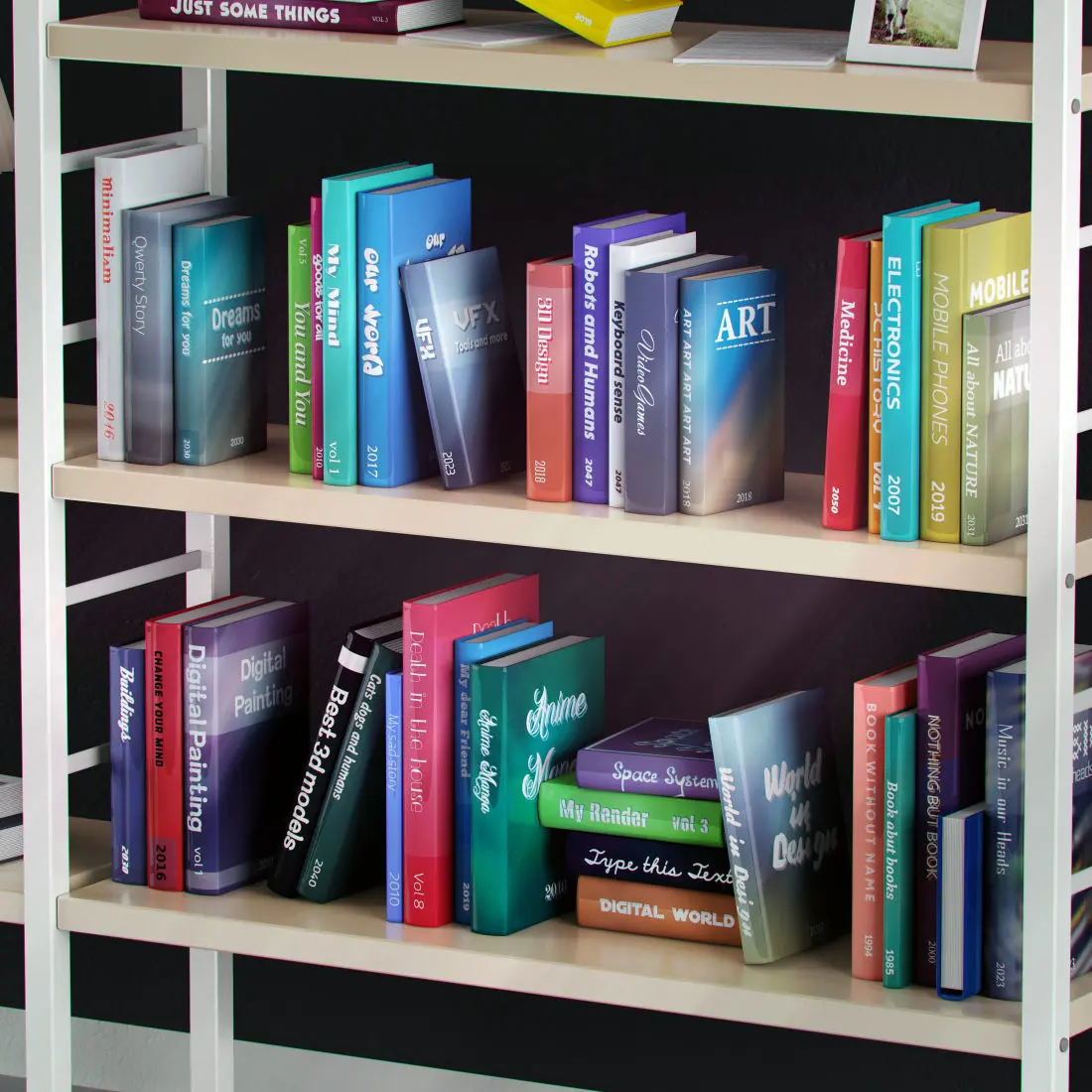 Objects in scene: 1 shelf, 52 unique books, 2 lamps, 3 vases, 1 decoration object, 2 boxes, 1 calendar, 4 papers, floor, wall.System objects: 5 cameras, 2 lights, render settings.Scene have correctly named objects and materials.Render settings included.