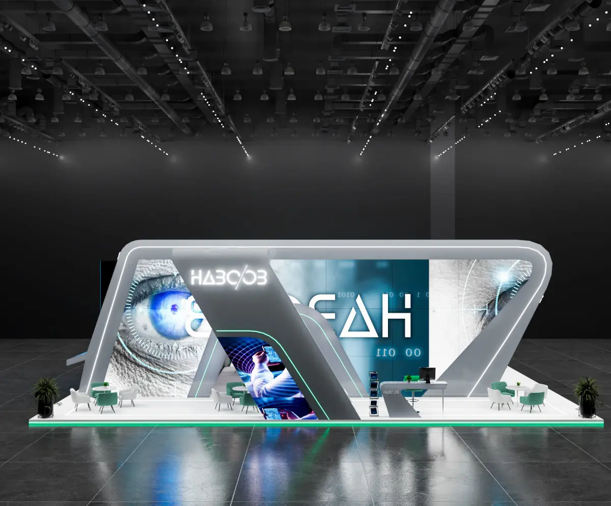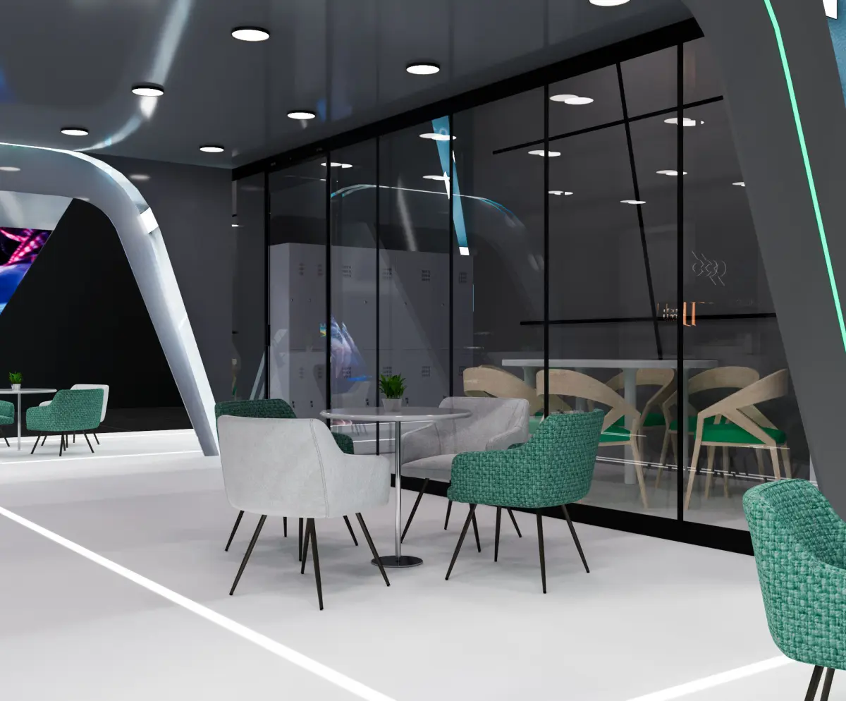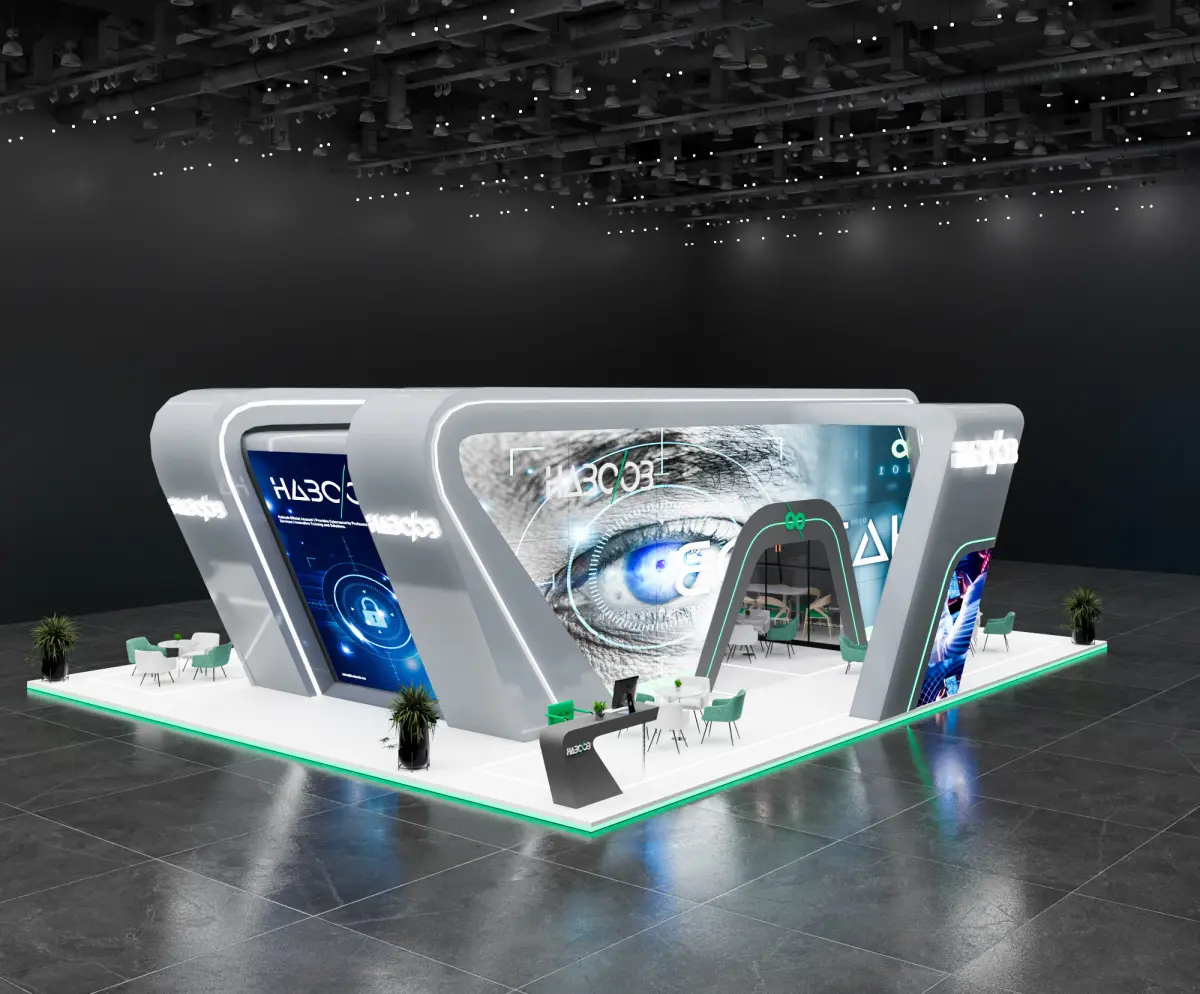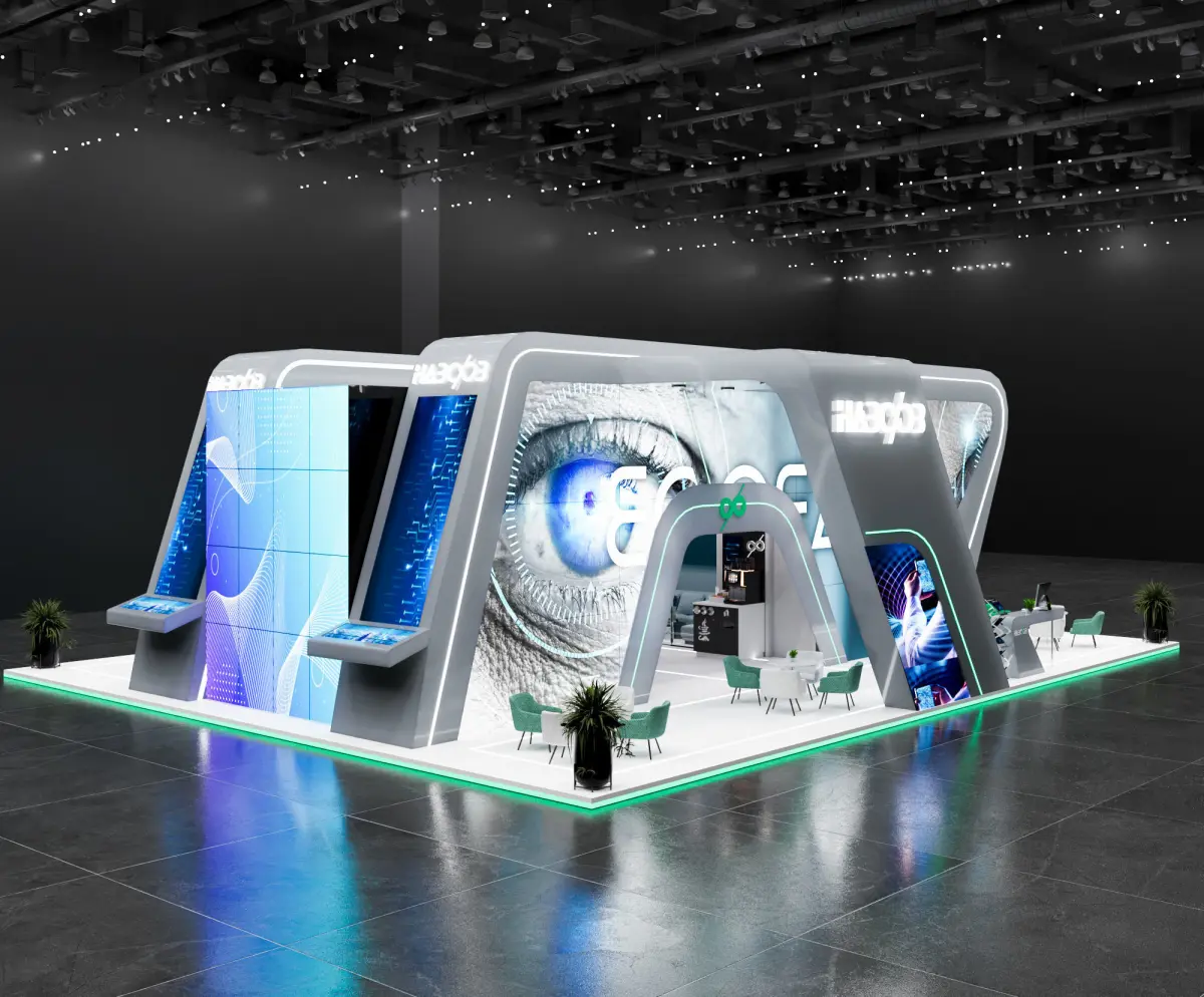 This is an exhibition booth design that you can adjust and use for your required design. I created this with 3ds max 2022 and all the rendering settings are included. adjust your size and render. Branding you will have to make it more beautiful.