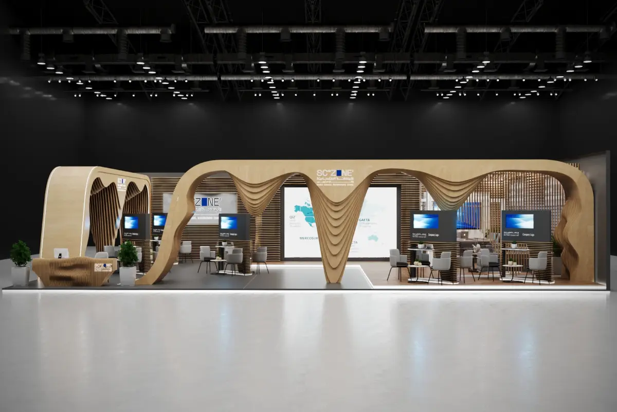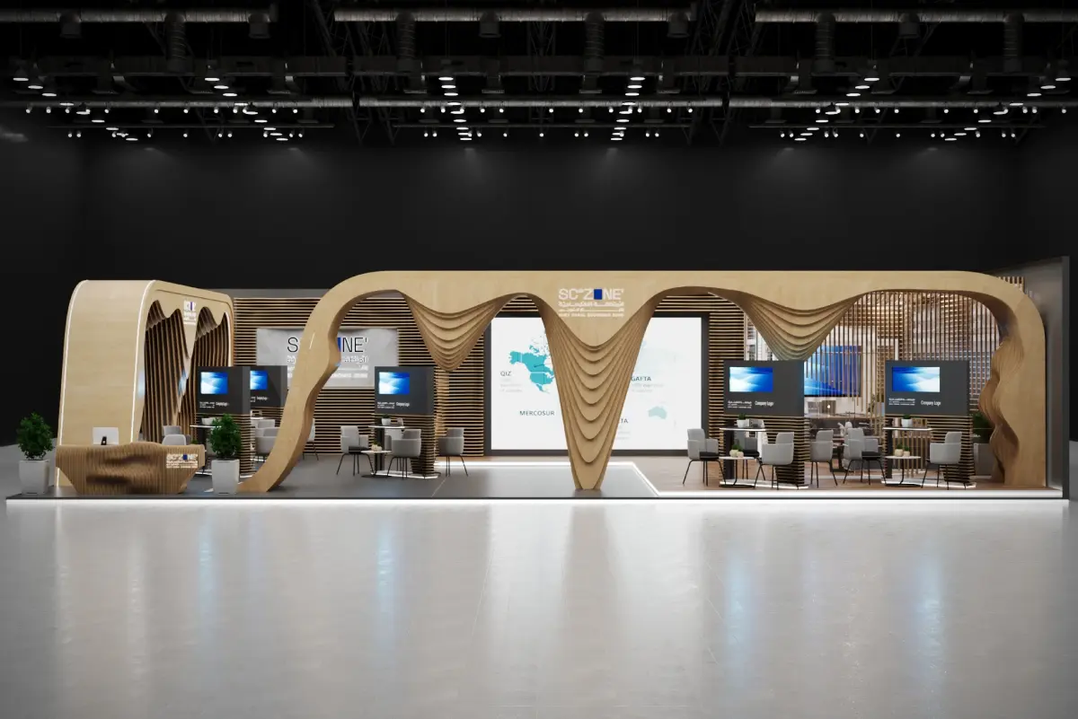 booth 11x15 an open file with settings and the same quality as in the pictures easy to modifications I have four years of design experience This is an exhibition booth design what you can ajdust and use for your required design. I created this with 3ds max 2022 and all the rendering settings are included. adjust your size and render. Branding you will have to and make it more beasutiful.