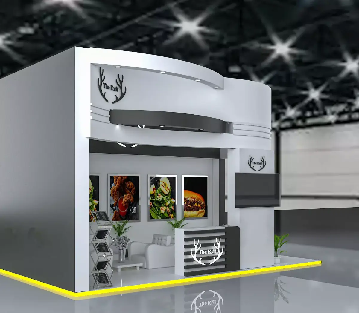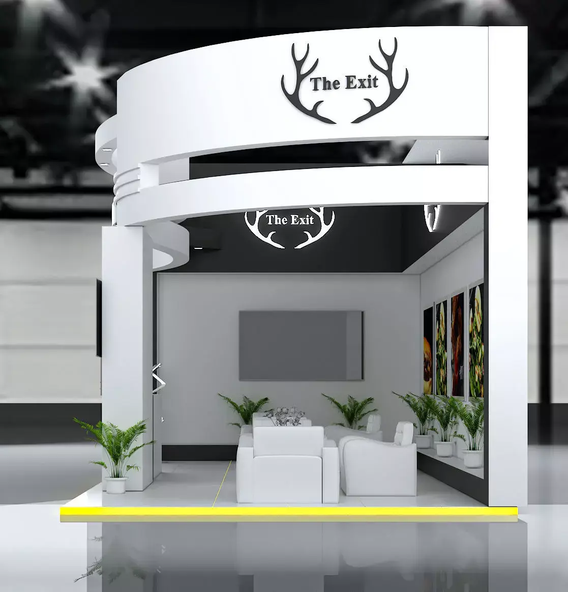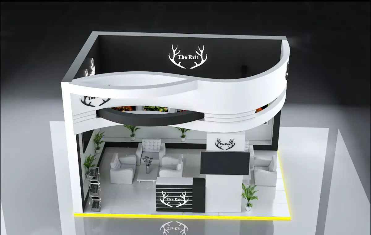 This is an exhibition booth design that you can adjust and use for your required design. I created this with 3ds max 2022 and all the rendering settings are included. adjust your size and render. Branding you will have to make it more beautiful.