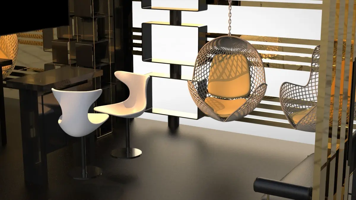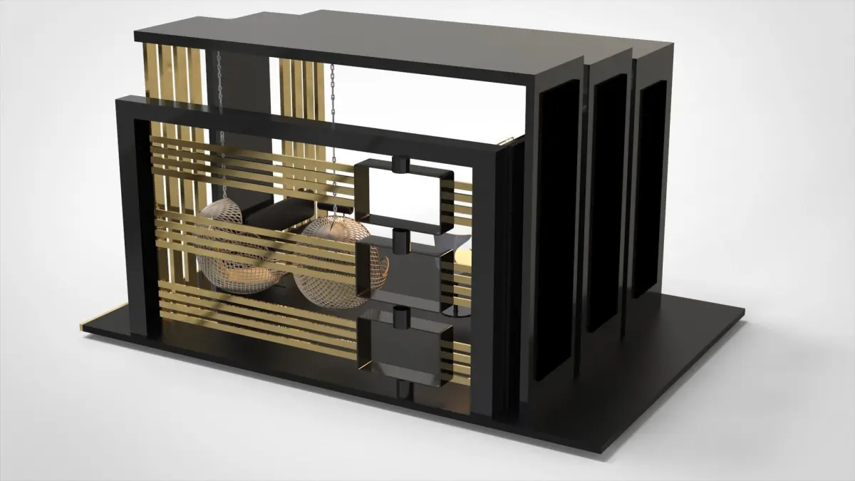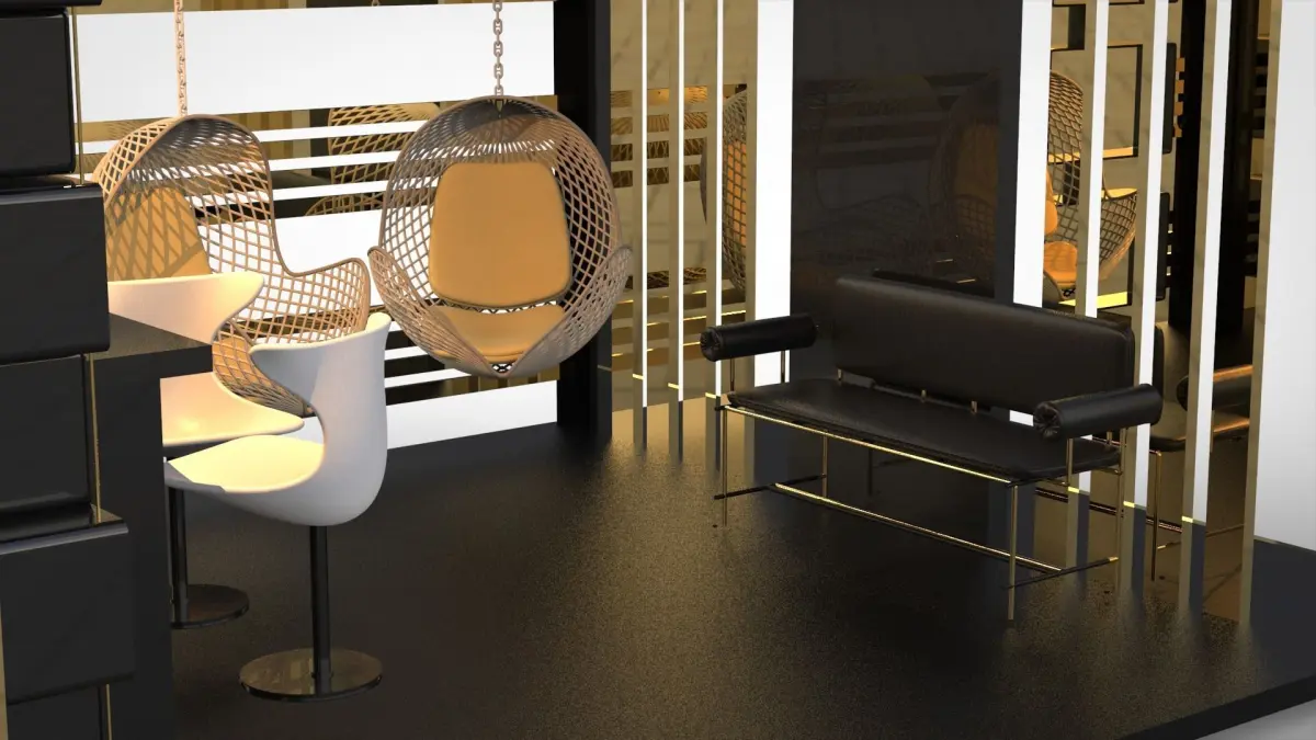 this an architectural design, for a stand/booth/exhibtion for a luxurious and bold brand or a company, it has all the elements the chair, screens, banners and everything ready. The design provides a wide space for people to interact, enter and sit, also it has the standing table for workers. it could be used and adjusted in different materials and colors as prefrence. all models could be used seperatly the chairs, tables, lights and screen.