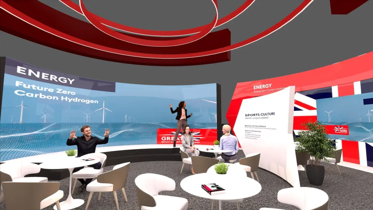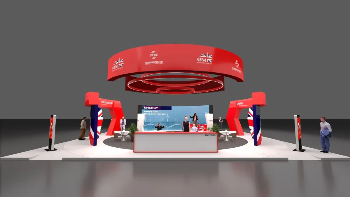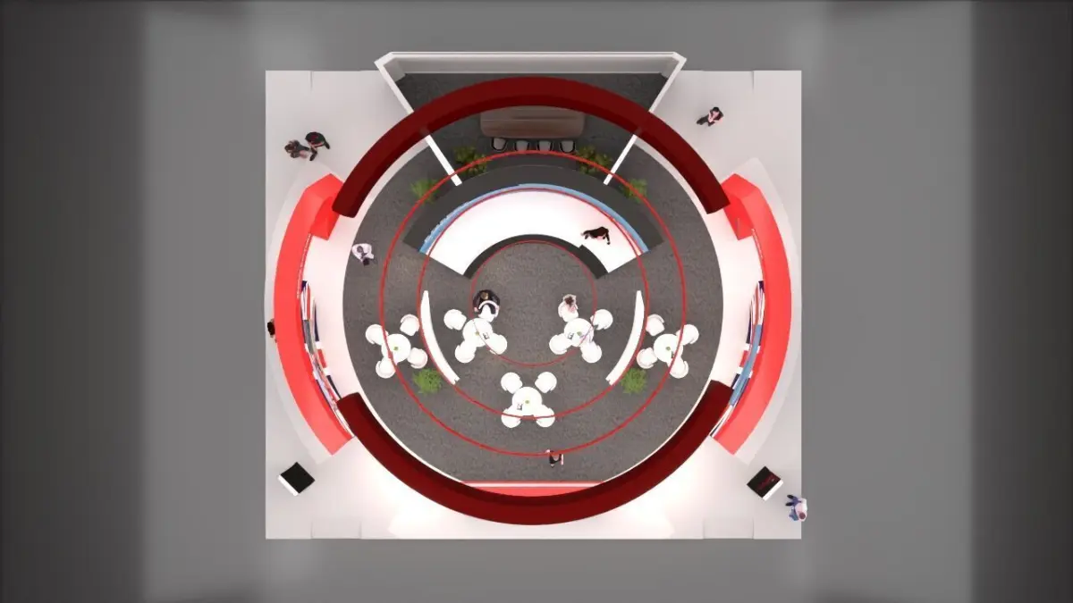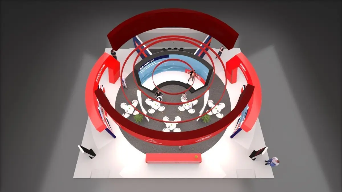 The exhibition booth measures 16m×14m in floor area with a height of 6m. The space features four functional zones: