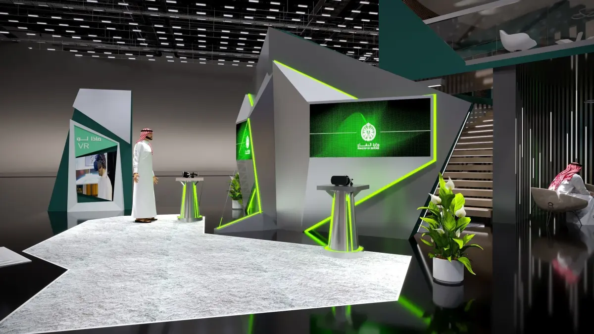 This is an exhibition booth design what you can ajdust and use for your required design. I created this with 3ds max 2022 and all the rendering settings are included. adjust your size and render. Branding you will have to and make it more beasutiful.