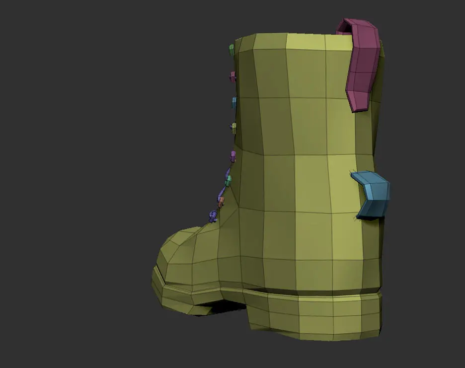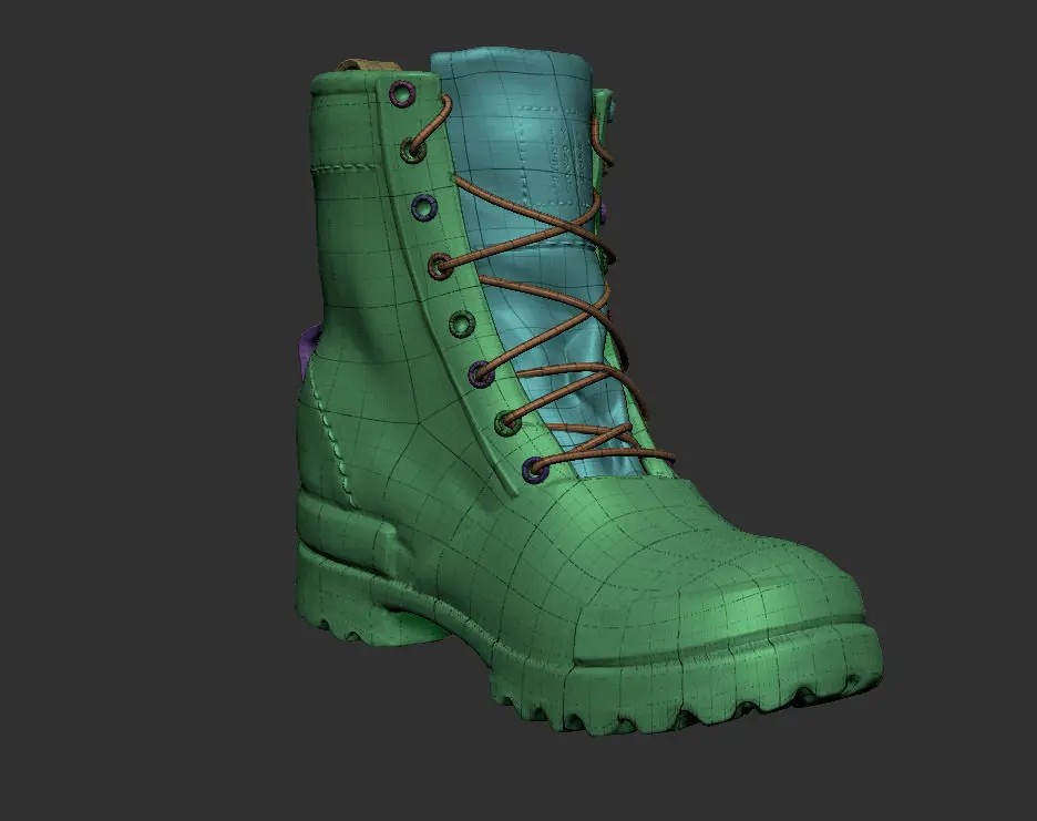 This is a Zbrush model.The boot has 5 subtools: Boot, Back, Tongue, Eyelets, Laces.The boot subtool has 8 subdivisions, the other ones have from 3 to 7. When all tools are merged, the lowest subdivision is 1295 polygons and the Highest is 6414120 polygons.The images are screenshots from Zbrush.