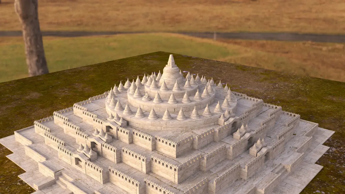 Borobudur, also transcribed Barabudur (Indonesian: Candi Borobudur, Javanese: ꦕꦤ꧀ꦝꦶꦧꦫꦧꦸꦝꦸꦂ, romanized: Candhi Barabudhur) is a 9th-century Mahayana Buddhist temple in Magelang Regency, not far from the town of Muntilan, in Central Java, Indonesia. It is the world's largest Buddhist temple.[1][2][3] The temple consists of nine stacked platforms, six square and three circular, topped by a central dome. It is decorated with 2,672 relief panels and originally 504 Buddha statues. The central dome is surrounded by 72 Buddha statues, each seated inside a perforated stupa.