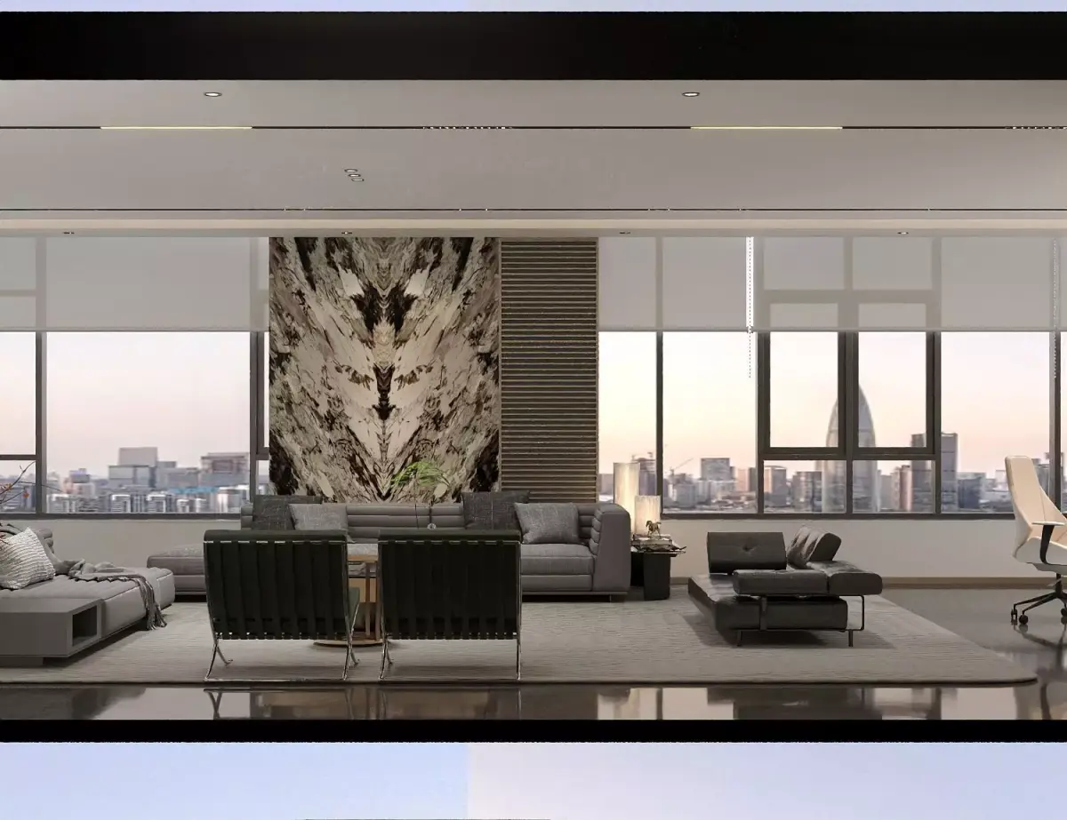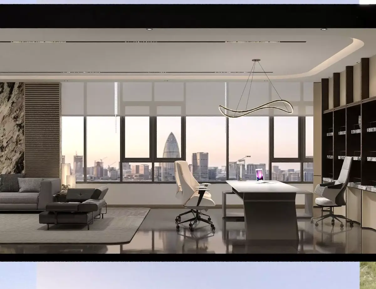 The picture shows a boss's office. The overall design is modern and stylish, with a spacious and bright space. The room is furnished with comfortable sofas, exquisite coffee tables, as well as office desks and chairs. The wall decoration is unique, and with soft lighting, it creates an elegant and professional atmosphere. The large windows allow plenty of natural light to enter and also offer a view outside, adding a touch of comfort to the office environment. It looks high - end and magnificent, and can provide the boss with a comfortable space conducive to efficient work.
