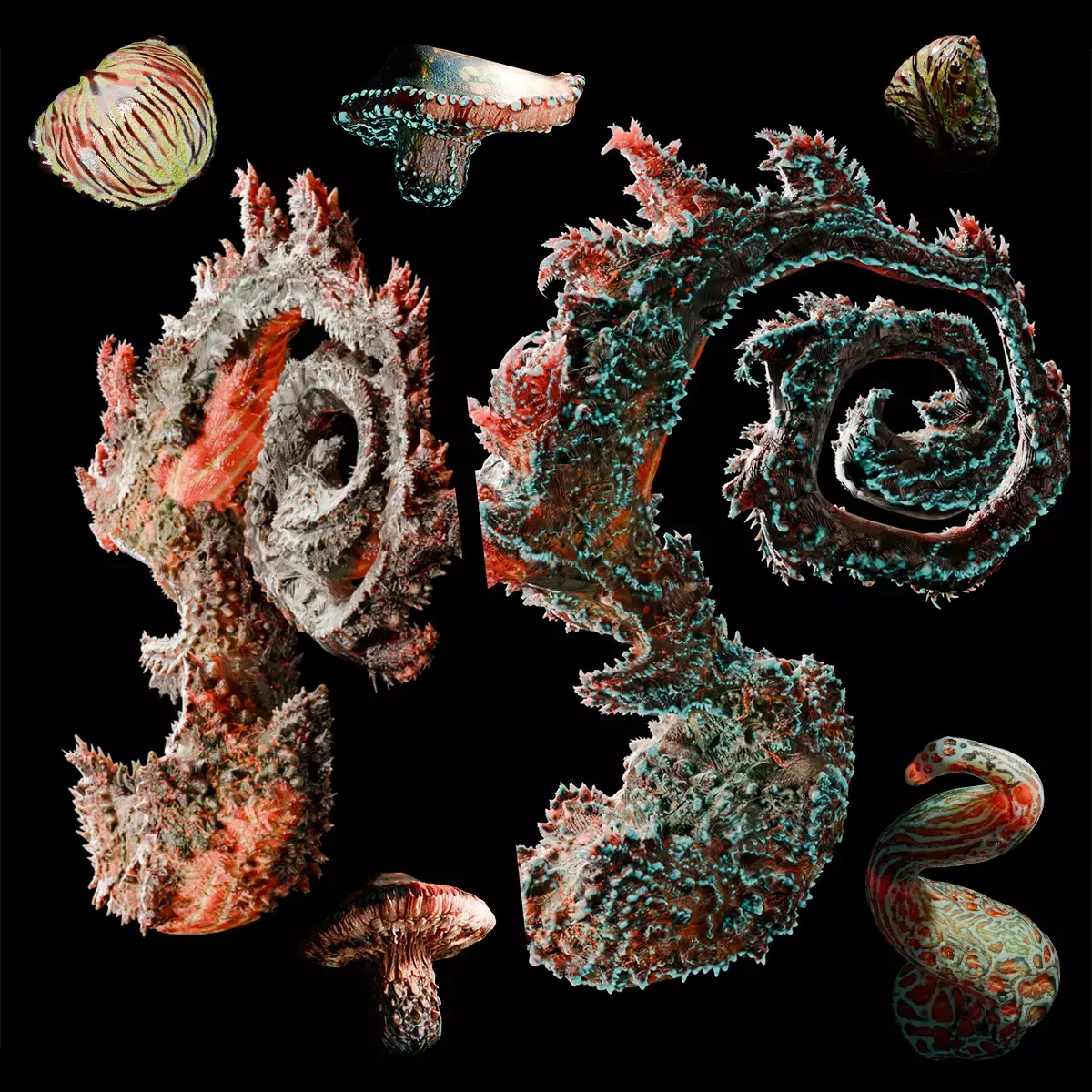 Hand-drawn sci-fi fantasy plant, original artwork. Every single detail and protrusion was designed and created by human hands without the use of artificial intelligence tools. Very high detail for rendering.