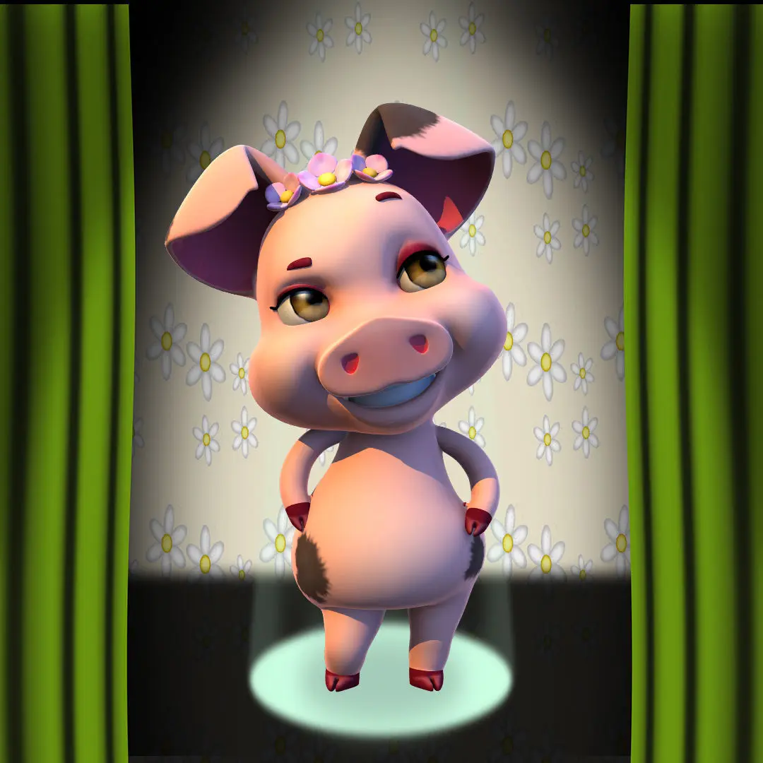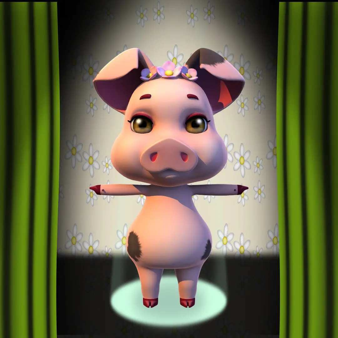Pretty sow pig with Bouguet on her head. Bouguet Pig Model : SubpatchFacial expression : Morph mixerRig : Basic Foot IKready to animate.