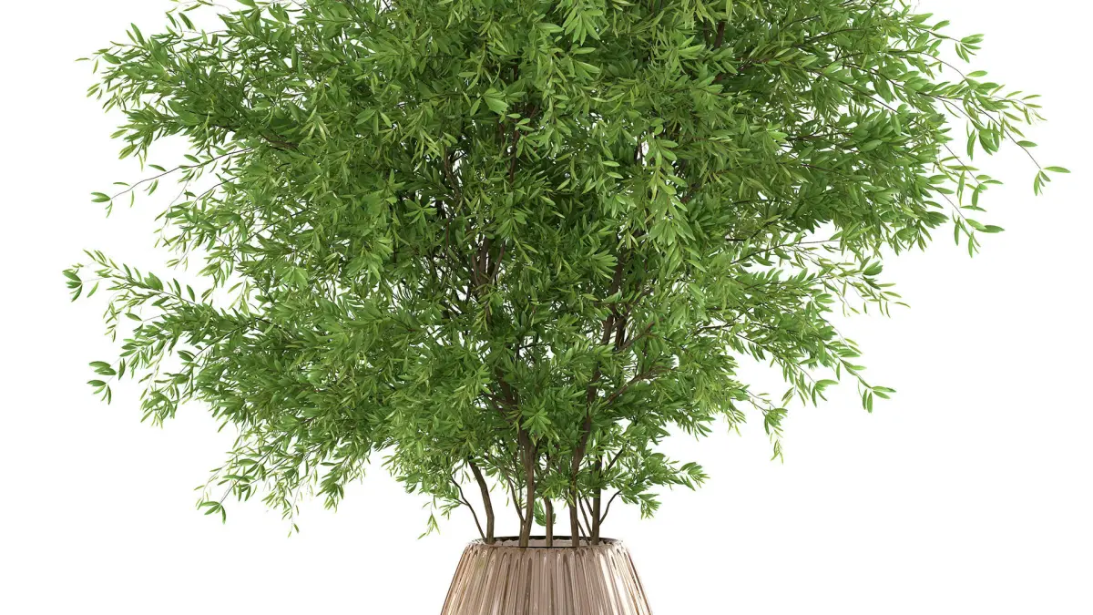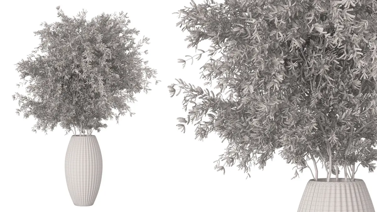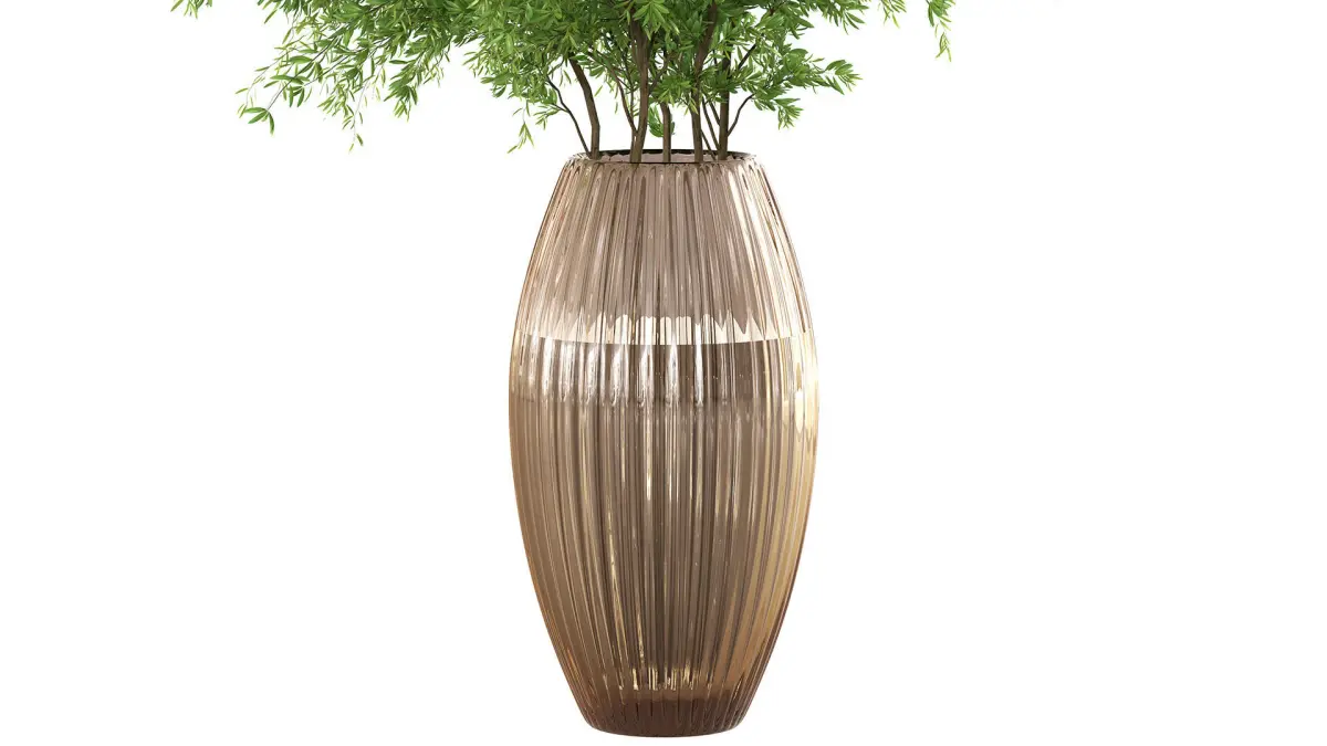 A realistic green bouquet with plants and branches, and a glass flower pot