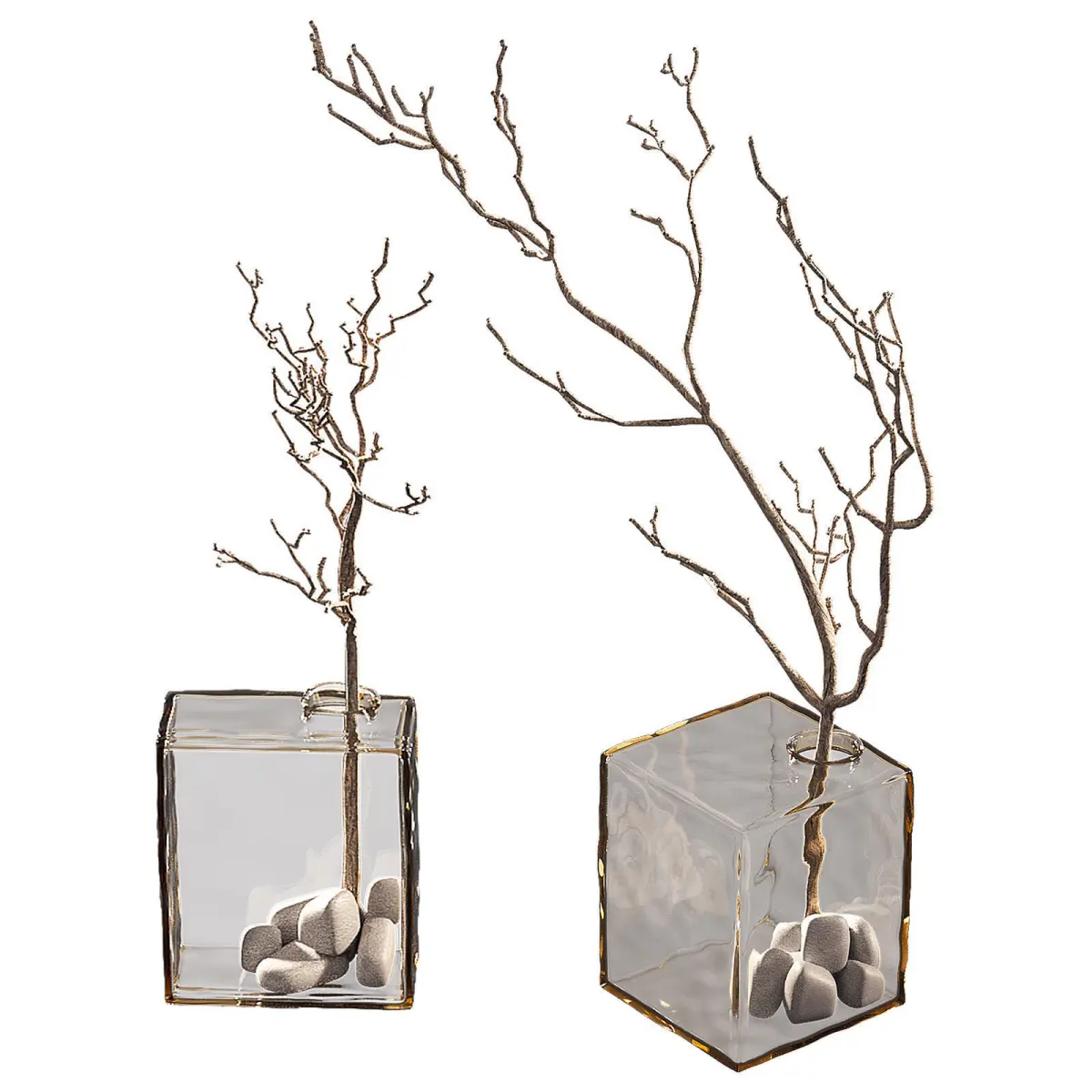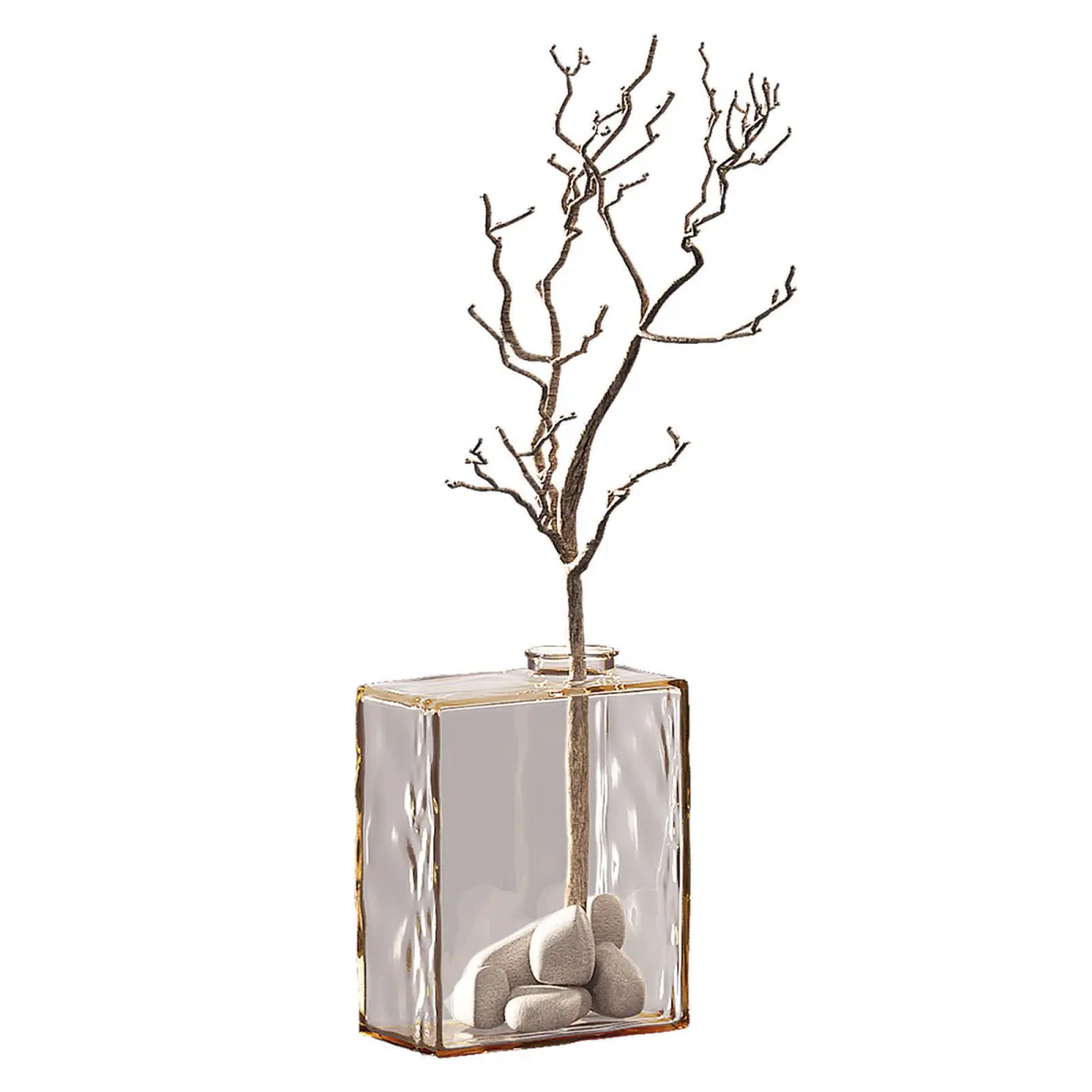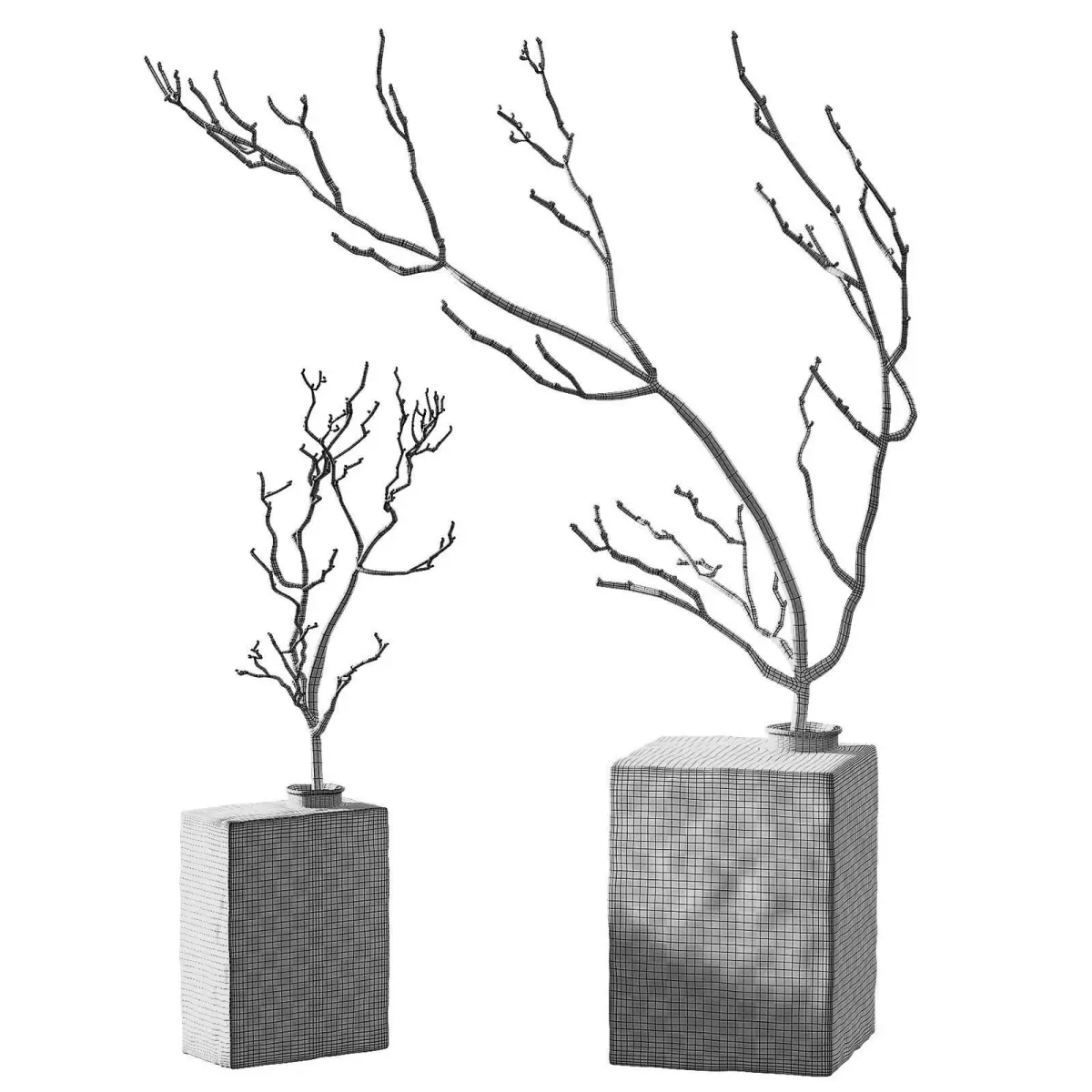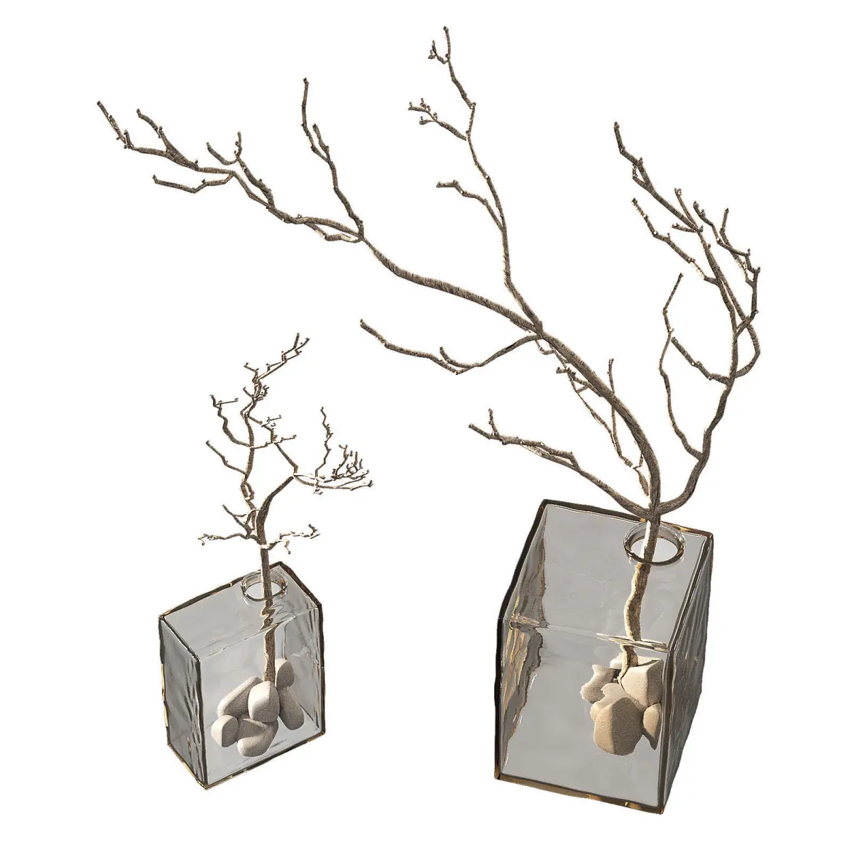 The 3D model contains fluted glass vases. Square and rectangular vases made of frosted glass with a branch of dried flowers. Decorative plant in a vase for interior in eco style.