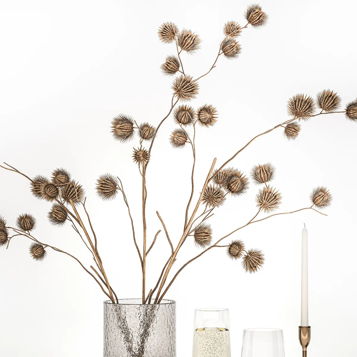 Dry branches, dry thorns, branches with thorns, thorn.Arctium - Great burdock, burdock, burdockdry thornscandlestick, candledried flower, branches, thorns, eco, decor, dry, thorn, vase, branches with thorns, natural decor, eco design, dry branches, glass, bouquet, thorn, wedding decor, a glass of sparkling wine