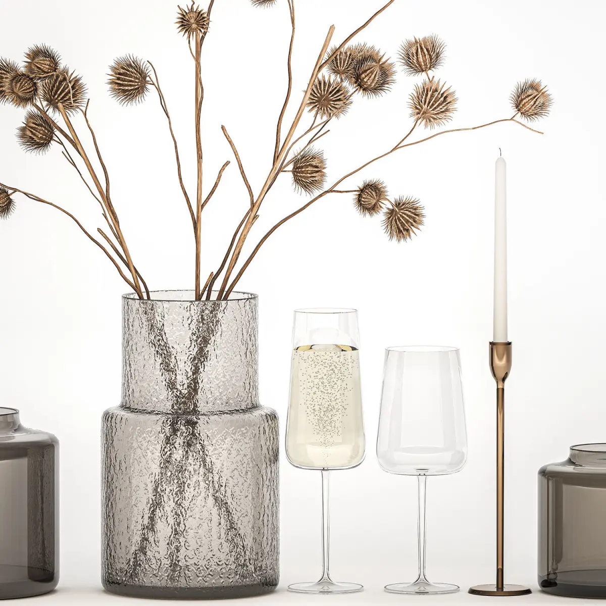 Decorative Bouquet of dry thorns in a glass vase for decoration and interior.ZARA HOME, ikeaGlass vase ikea, IKEA, KONSTFULL, ZARA HOMEWedding decor, a glass of sparkling wine with bubbles, a candlestick