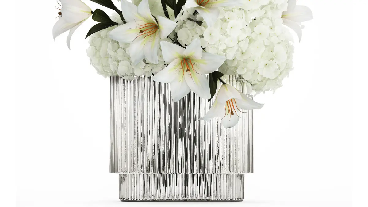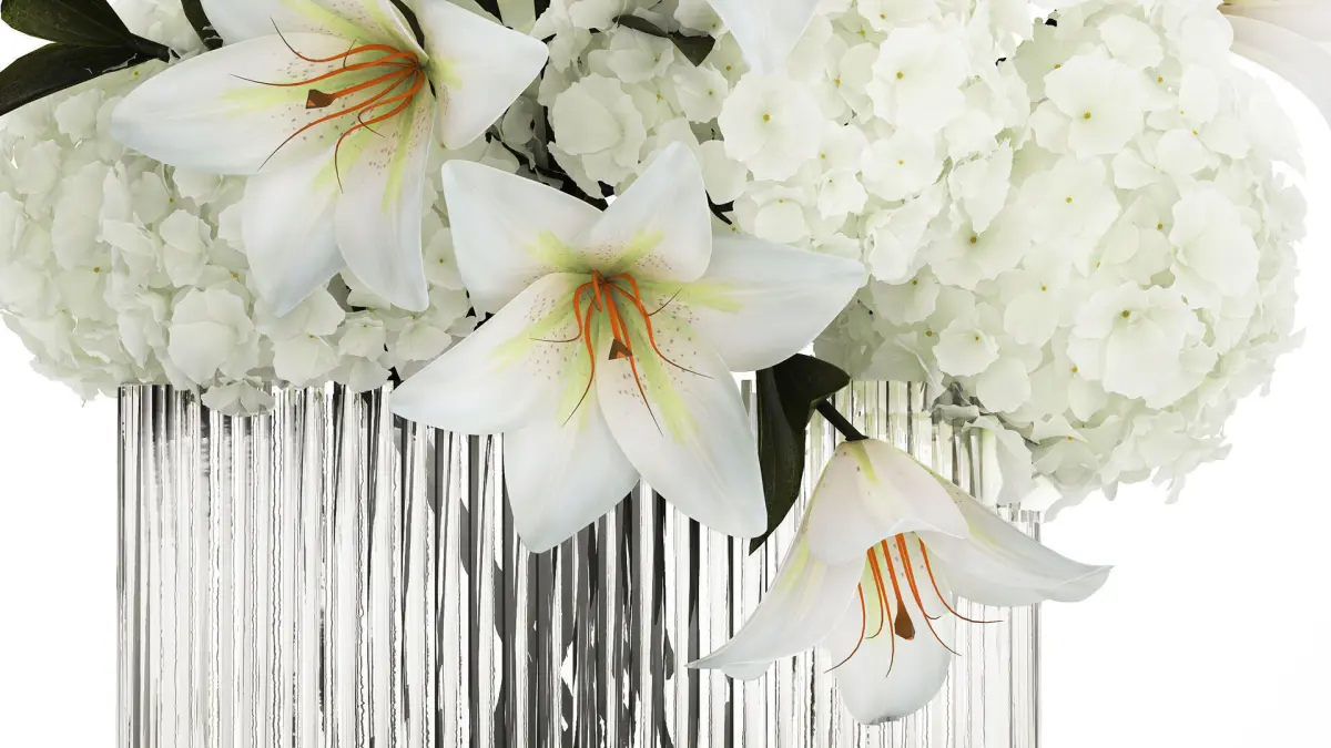 White formal bouquet of flowers and greenery in a modern glass vase, hydrangea, lilies. Set 511.Decorative Bouquet of white flowers in a glass vase for decor and interior.Bouquet of branches and flowershydrangea - white hydrangeaSpring bouquetLilium, Liliaceae - white Liliesvases - 2.hm, H&M HOME