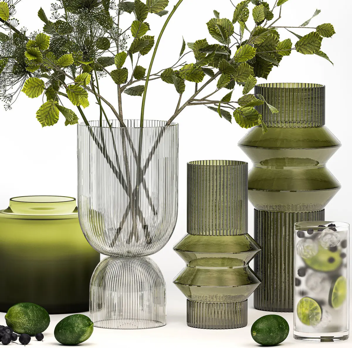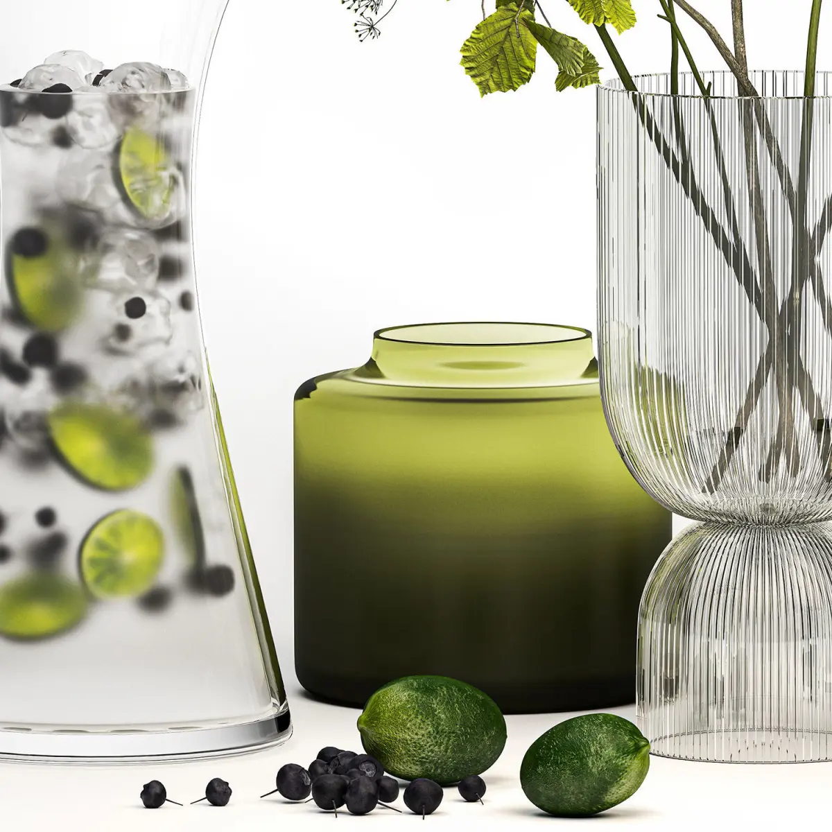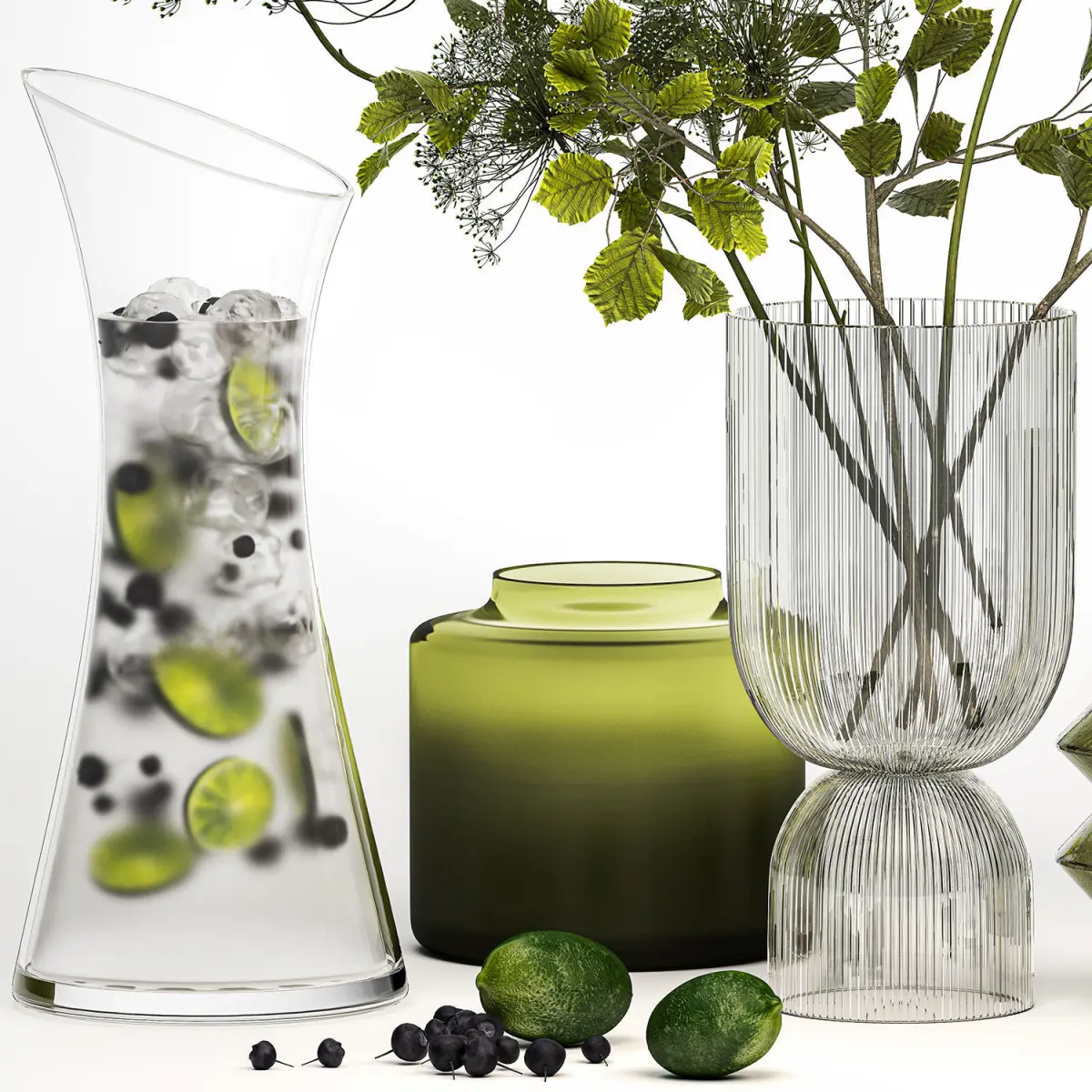 branches, vase, green glass, natural decor, eco design, luxury decor, stylish, Hogweed Bouquet, Hazel, hazel, leaves, Linden branch, set, Lemonade, decanter, ice, citrus, lime, lemon, blueberries, blueberries, berries, drink, cocktail