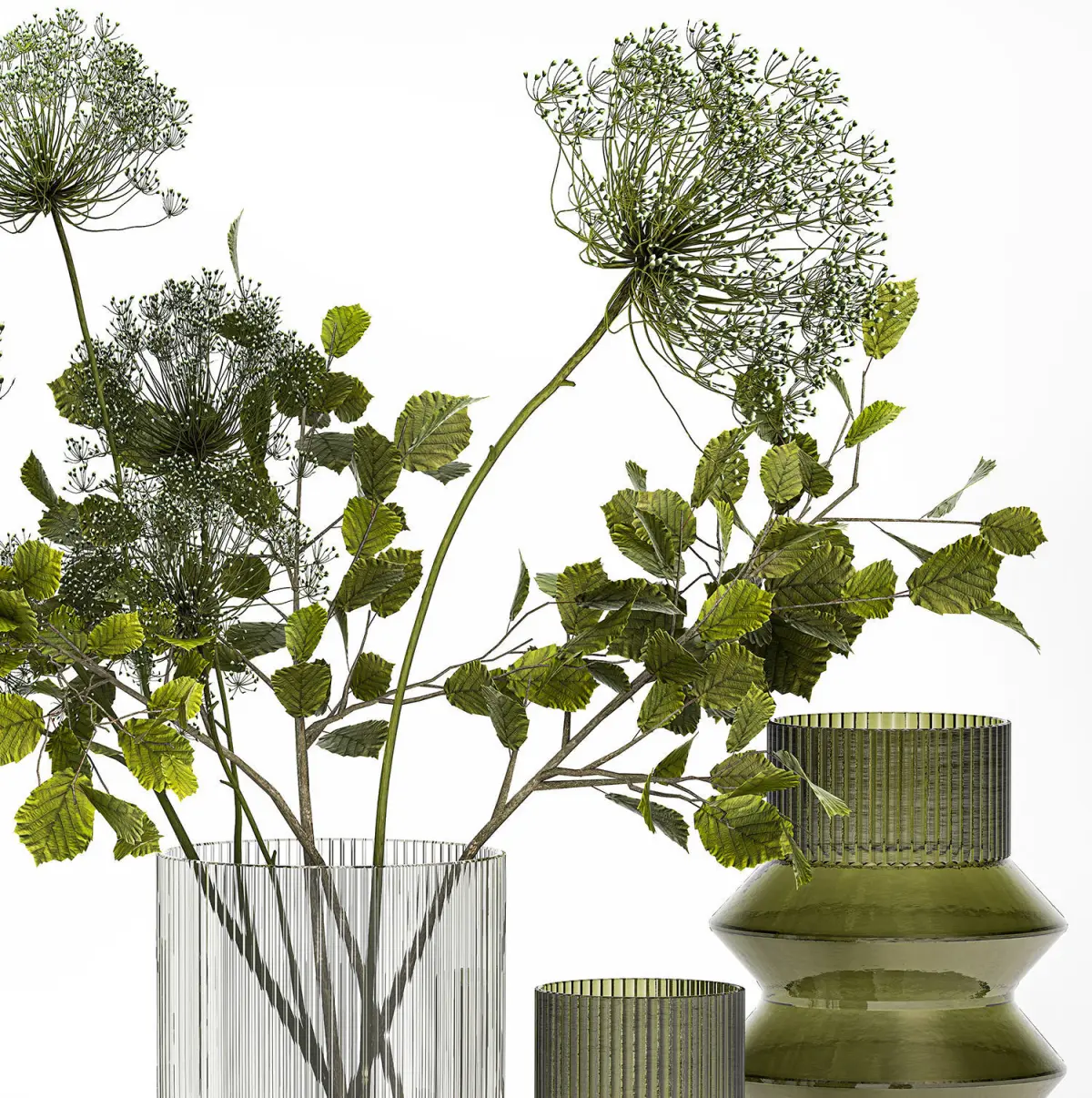 Decorative Bouquets of green branches with leaves in vases for decoration and interior.Bouquet of flowers.Lemonade, decanter, ice, citrus, lime, lemon, blueberries, blueberries, berries, drink, cocktail.Glass vase Vase verre Nordal Riva, RILLA VASE- NORDALHeracleum - hogweedCow Parsnip, hogweedCorylus, filbert, Hazel - hazel, hazelTilia - Linden